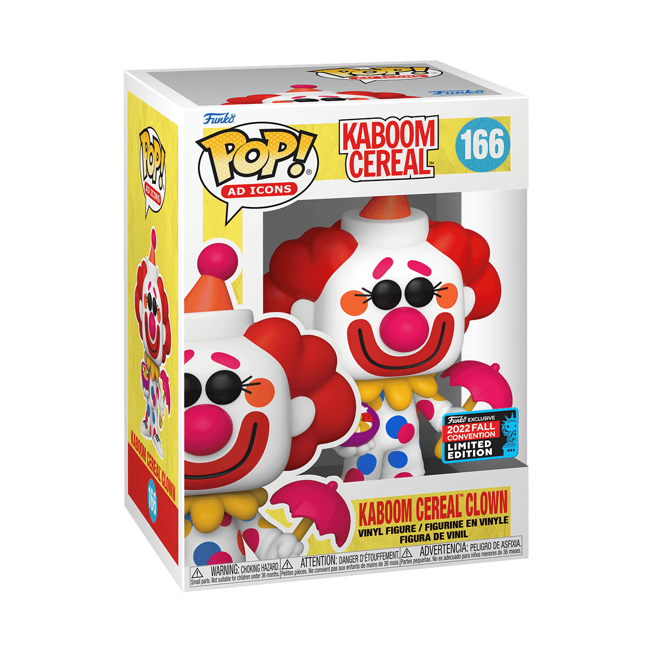 With candy stars and a vitamin charge, Pop! Kaboom Cereal ™ Clown wants to blast into your Pop! Ad Icons collection. This 2022 New York Comic-Con exclusive explodes with lots of color, as the Pop! cereal mascot holds out a bowl of crunchy, smiley-faced rings and an umbrella. Enjoy a nostalgic breakfast treat in a brand-new way and start every day with Pop! Kaboom Cereal ™ Clown. Vinyl figure is approximately 4.73 in (12 cm) tall.