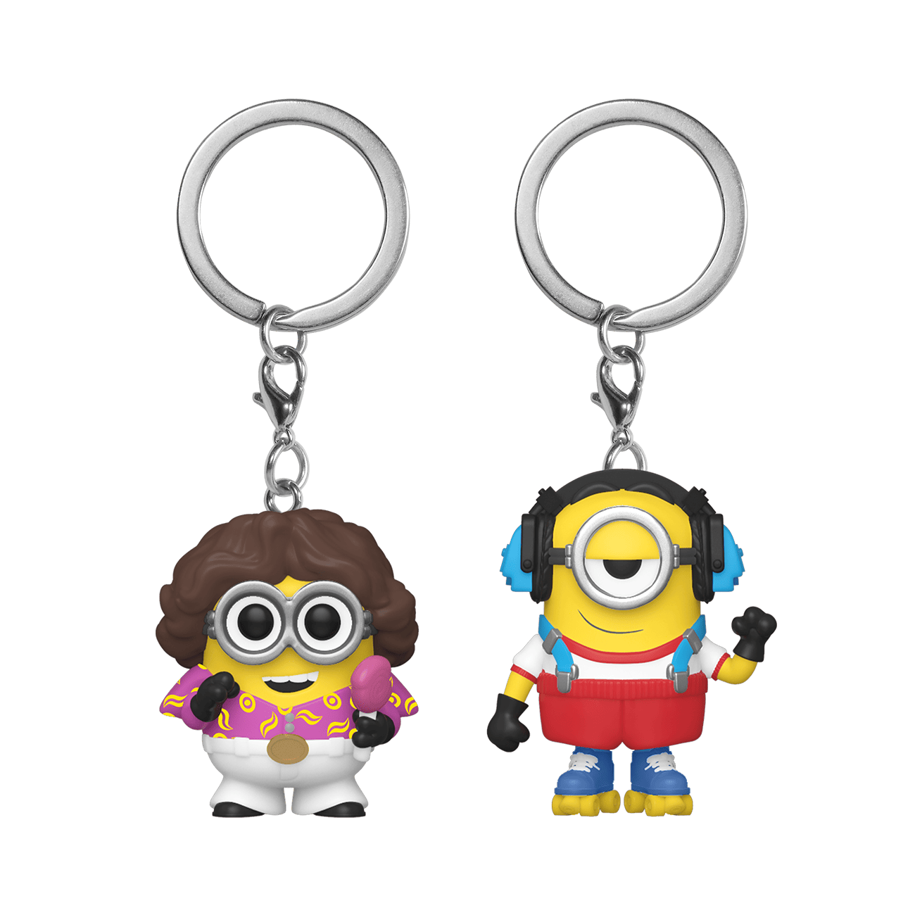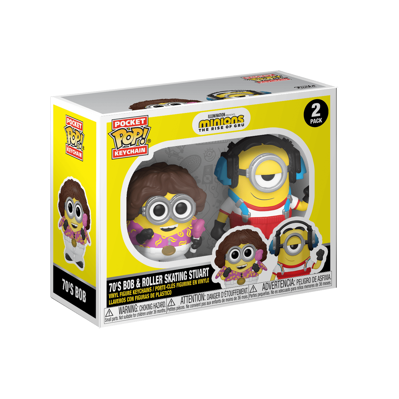 Banana! The Minions are ready for an adventure! Take them with you wherever you go with this exclusive Pop! Keychain 2-Pack of 70s Bob and Roller-Skating Stuart. Let them follow you home and stir up some fun in your Minions: The Rise of Gru collection. Vinyl keychains are approximately 4 in (10.2 cm) long.