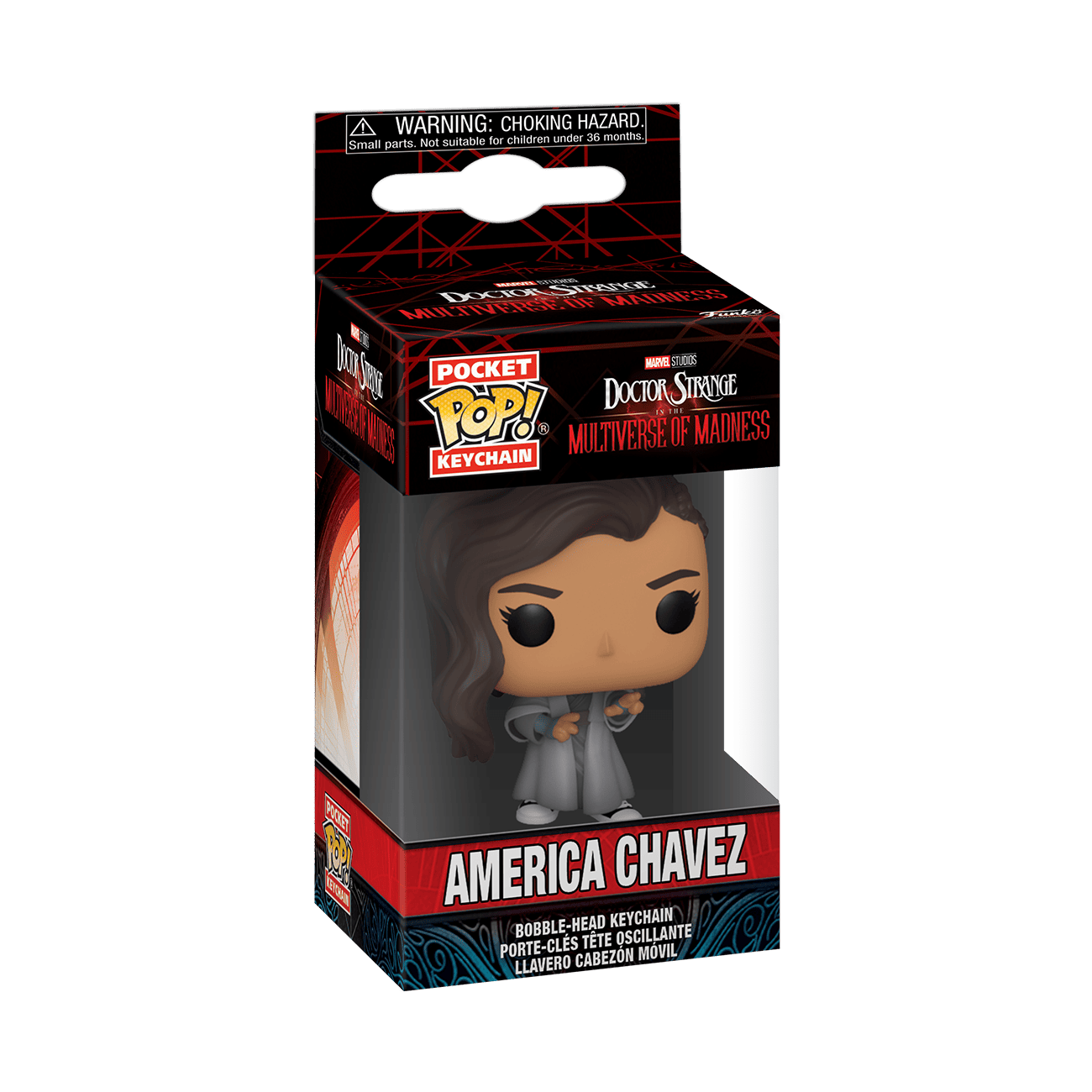 Test the limits of reality and leap into the Marvel multiverse with Pop! Keychain America Chavez from Doctor Strange in the Multiverse of Madness! Pop! America Chavez looks ready for any challenge, dressed in a gray cloak. Vinyl keychain is approximately 4 in (10.2 cm) long.