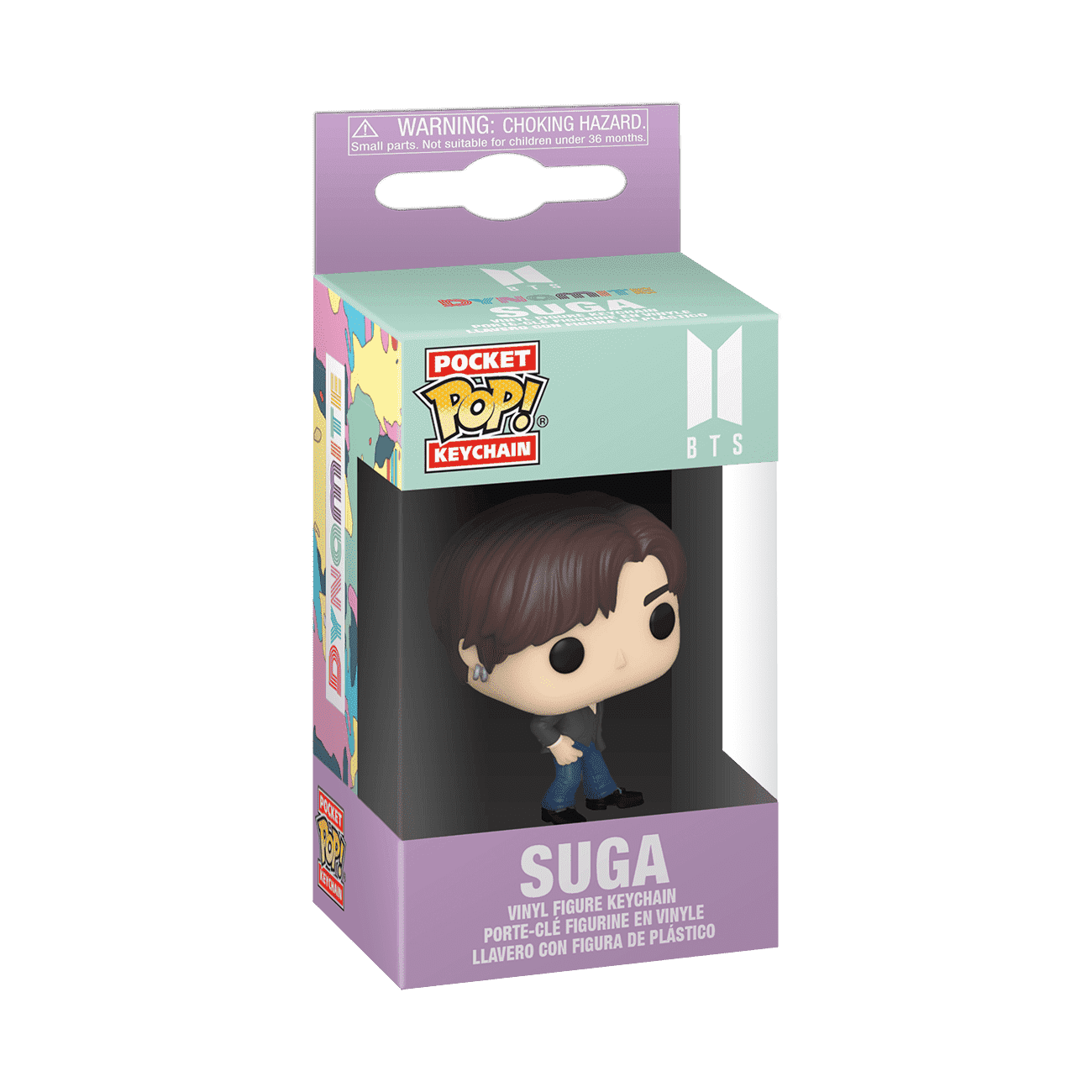 Carry a Pocket Pop! Keychain of one of your favorite BTS members, SUGA. Vinyl keychain is approximately 4 in (10.2 cm) long.