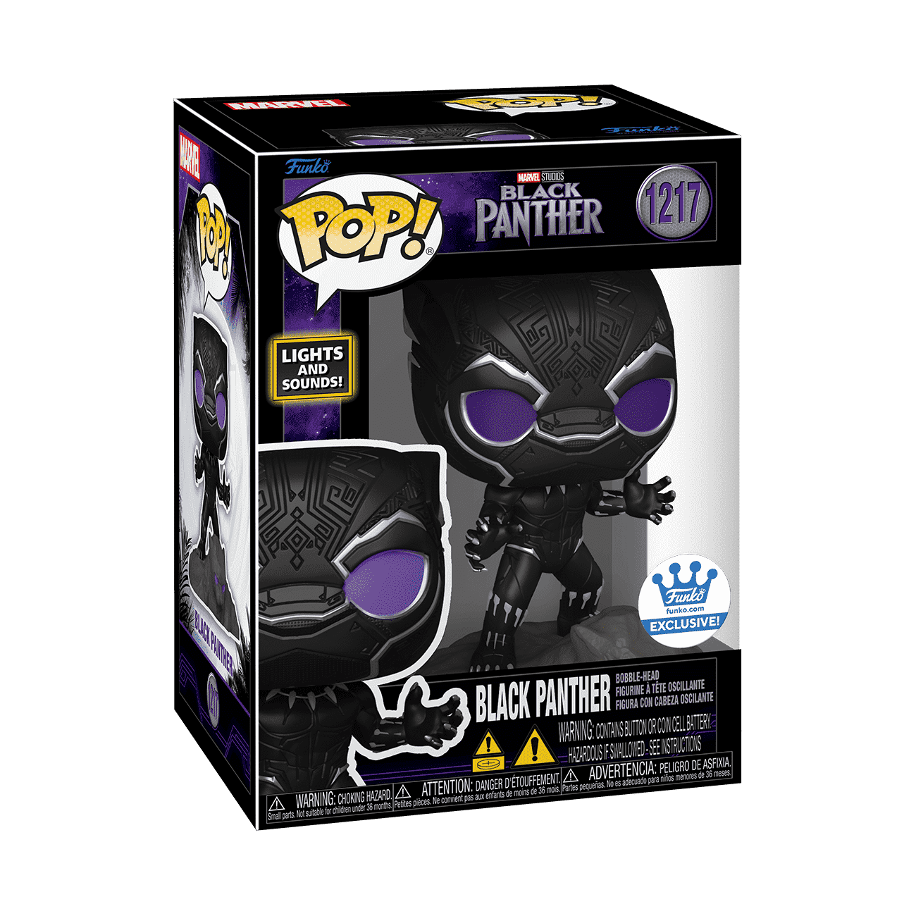 The king of Wakanda is here to save his people, and the world, as Pop! Black Panther! Bring King T’Challa into your Marvel Studios’ Black Panther™ collection with this Funko exclusive, Lights and Sounds Pop! Black Panther. Vinyl bobblehead is approximately 4.35 in (11 cm) tall.