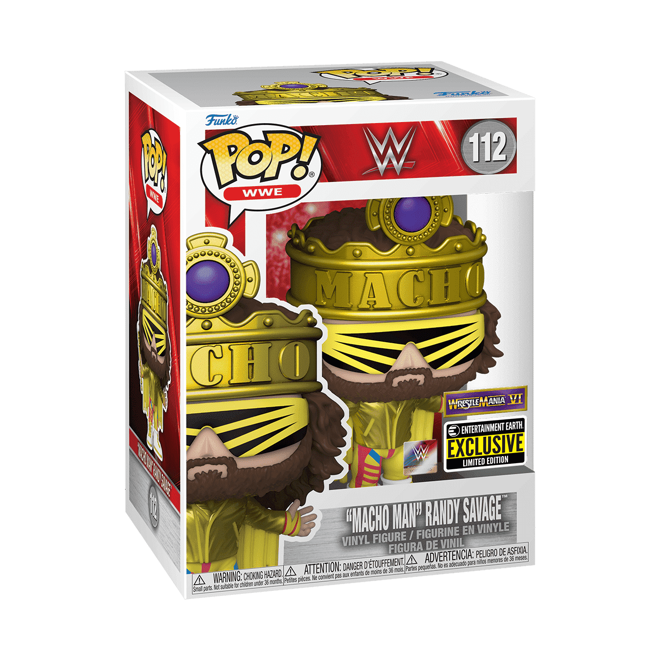Ring the bell and welcome Entertainment Earth Exclusive Pop! “Macho Man” Randy Savage to the spotlight! Glittering in metallic gold, Pop! “Macho Man” Randy Savage shines. Bring his intense, winning style to your own Wrestlemania 6 match ups and expand your WWE sports collection. Vinyl figure is approximately 5 in (12.7 cm) tall.