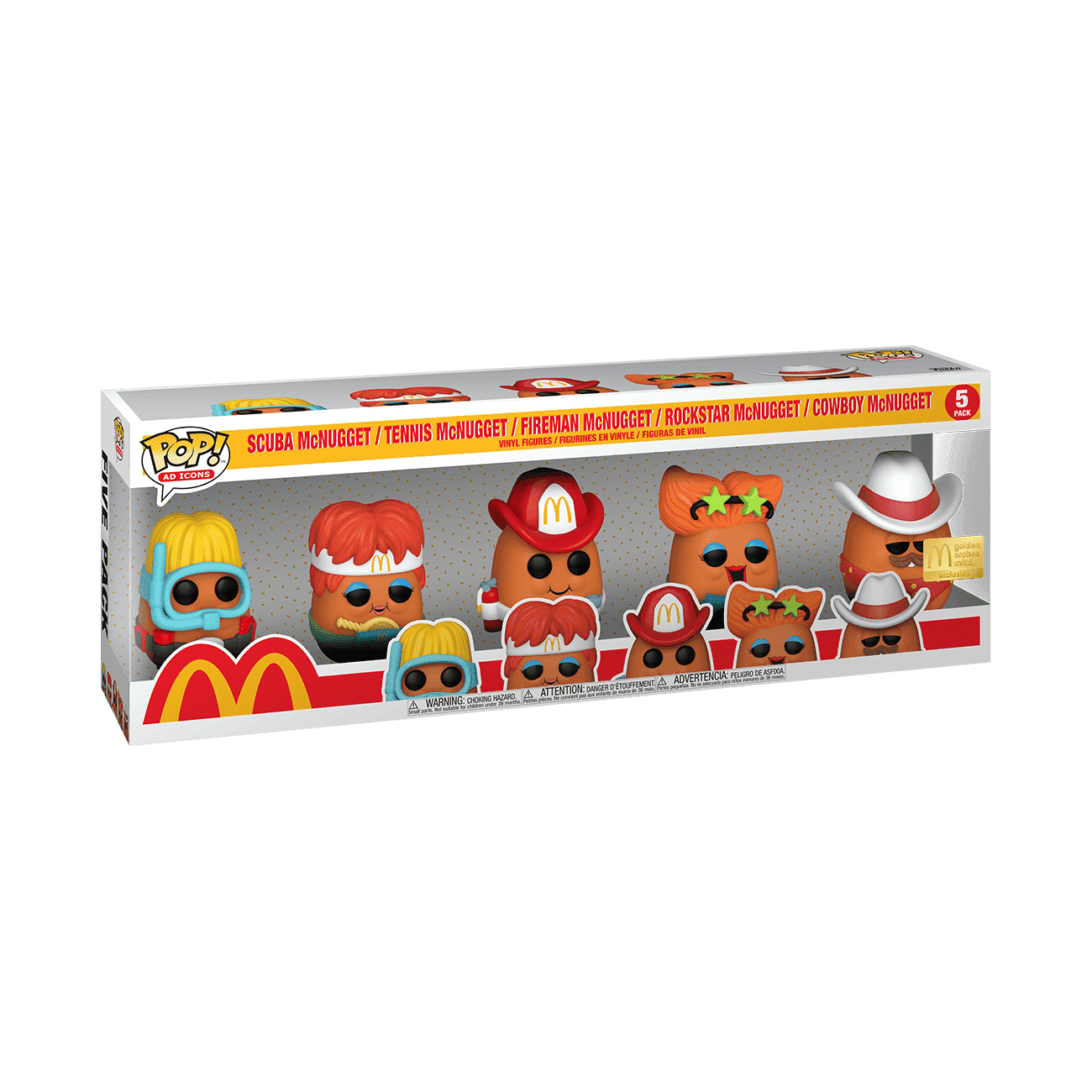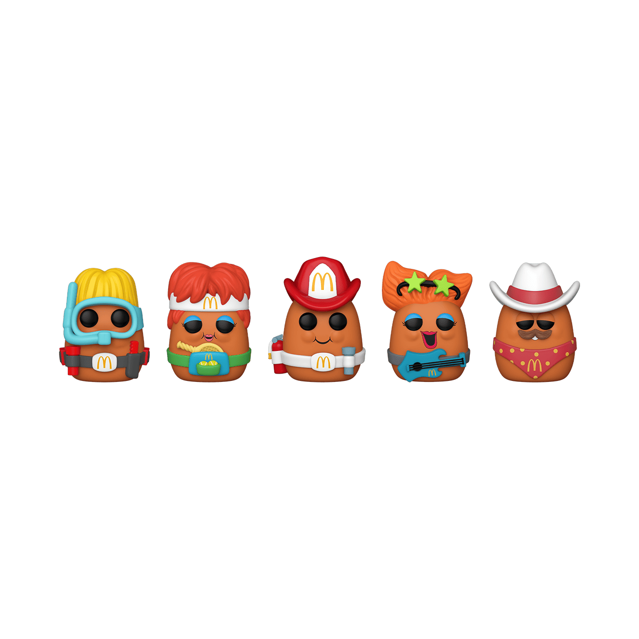 Get a piece of your childhood back and bring home a 5-Pack of Pop! McDonald’s McNugget Buddies. Included in the set are Scuba McNugget, Tennis McNugget, Fireman McNugget, Rockstar McNugget, and Cowboy McNugget. They’ll make an exciting and energetic addition to your Pop! Ad Icons collection. Vinyl figures are approximately 3-3.27 in (8.3 cm) tall.