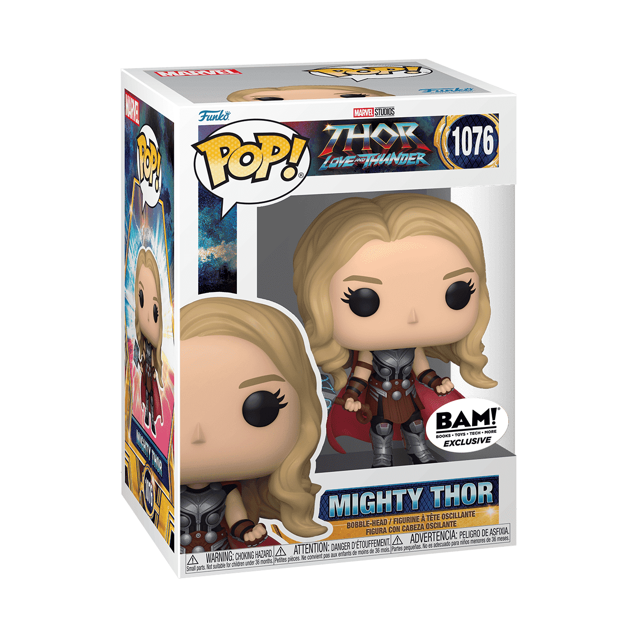 Electrify your Marvel collection with Pop! Mighty Thor. This BAM!-exclusive Pop! Mighty Thor, from Marvel Studios' Thor: Love and Thunder, wields Mjolnirāand sparkles with gold metallic details. Vinyl bobblehead is 3.84 in (9.8 cm) tall.