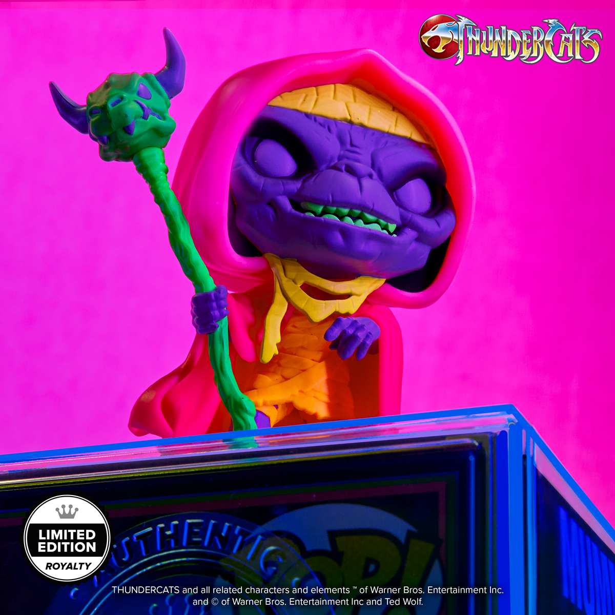Become ever-living with POP! Mumm-Ra™! This black light POP! Mumm-Ra is summoning the forces of evil, so unite Lion-O™ and the rest of the Cats for battle in your ThunderCats™ collection. Only 3,500 of this Limited Edition – Royalty collectible were made! This exclusive figure comes pre-packaged in a UV Premium Plastic POP! Protector—perfect for preventing damage to your collectible. Vinyl figure is approximately 3.9 in (9.9 cm) tall.