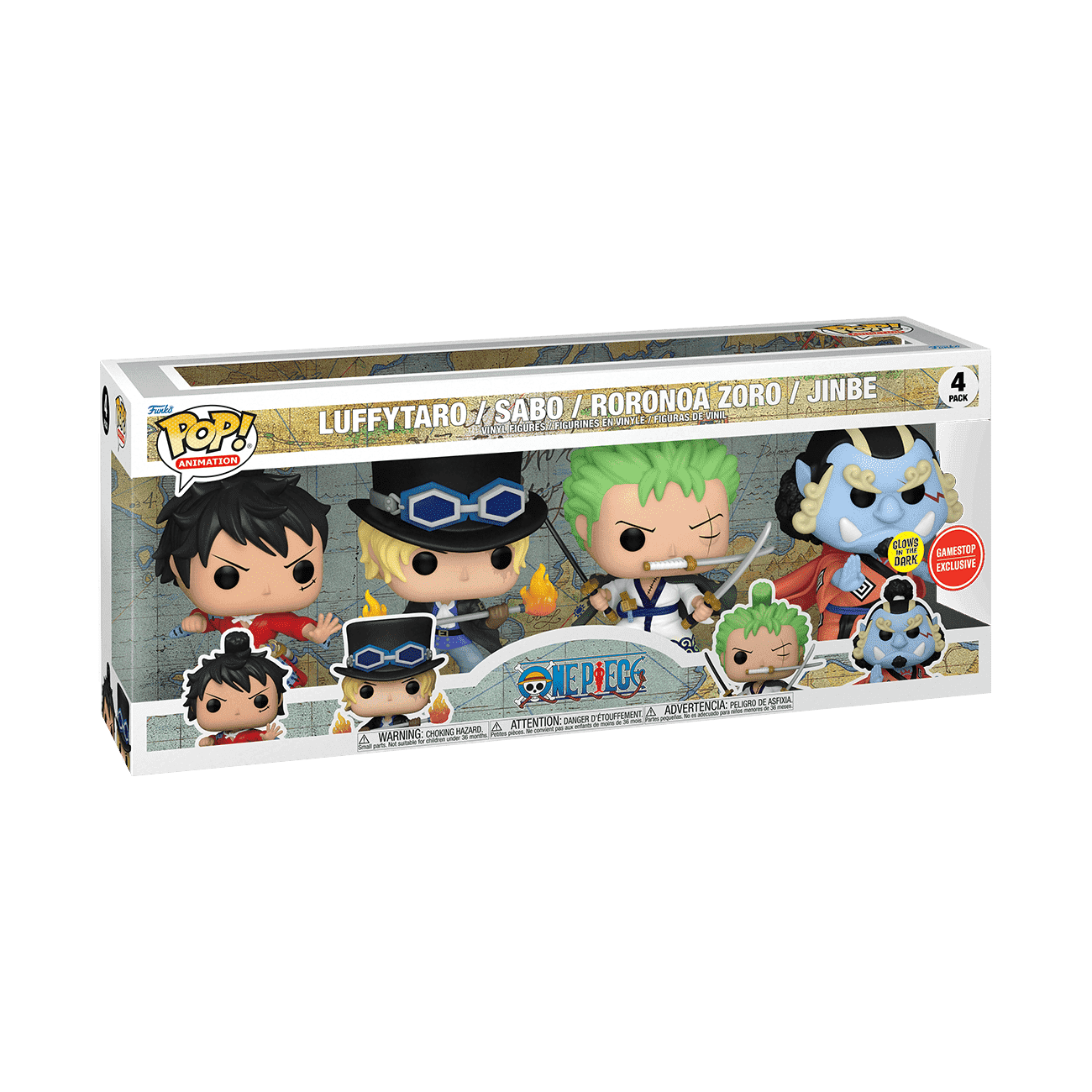 Monkey D. Luffy is determined to become the Pirate King by finding Gol D. Roger's legendary treasure. Help Luffy on his journey by bringing Pop! Luffytaro, Pop! Sabo, Pop! Roronoa Zoro, and Pop! Jinbe into your One Piece collection. Complete your scurvy crew with this exclusive 4-pack of pirates, including glow-in-the-dark Pop! Sabo. Vinyl figures are approximately 4 to 4.8 in (12.2 cm) tall.