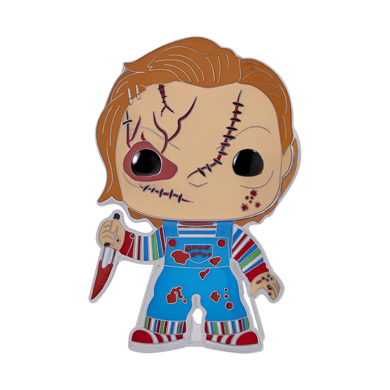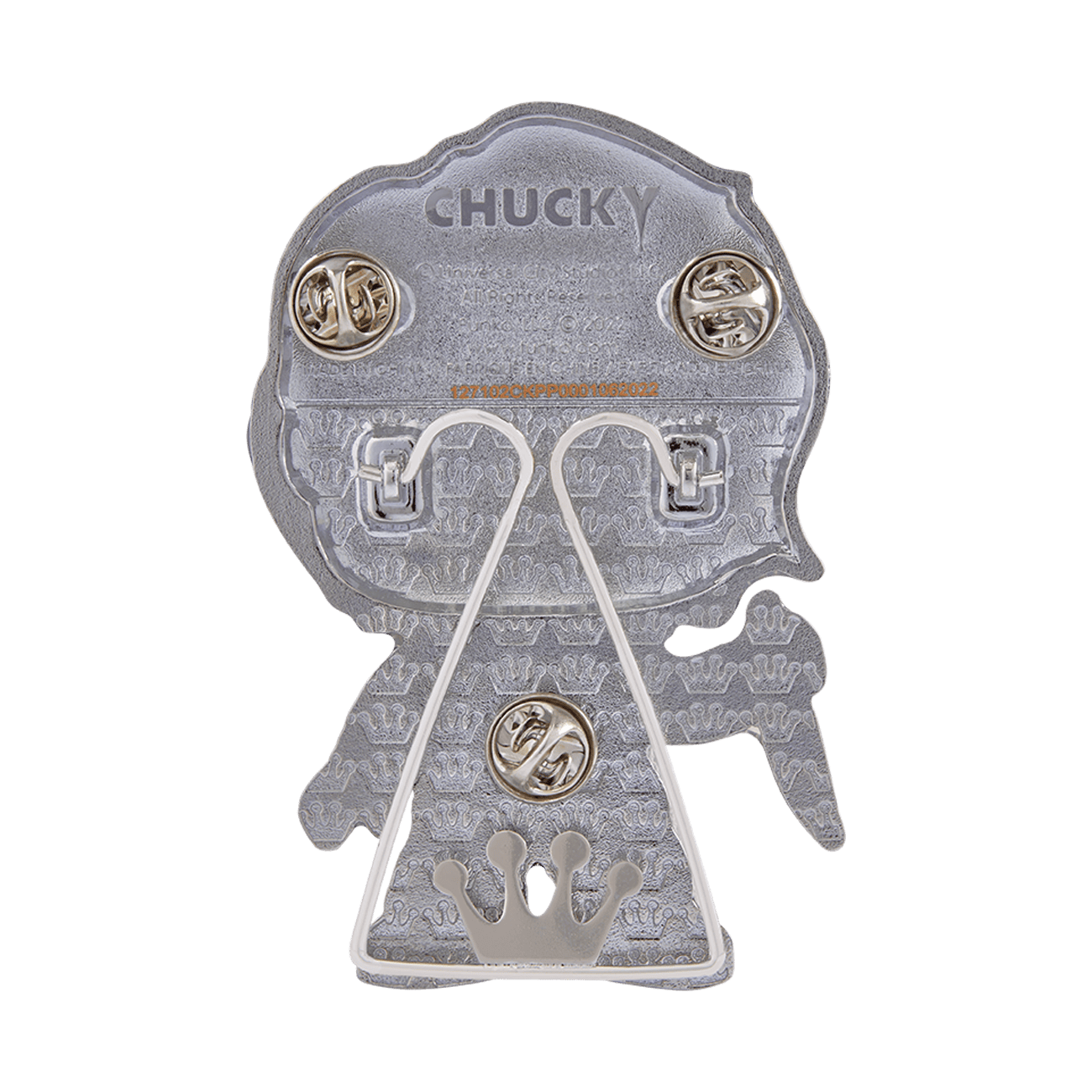 Schedule a playdate with Chucky as a Pop! Pin. Pop! Pin Chucky makes a killer accessory for any outfit. Capture him to haunt your wardrobe. Pin features 3D molded details, shiny silver metal-colored hardware, the signature Loungefly/Funko crown debossing on the back, and a built-in stand. Enamel-fill pin is approximately 4 in (10.2 cm) tall.