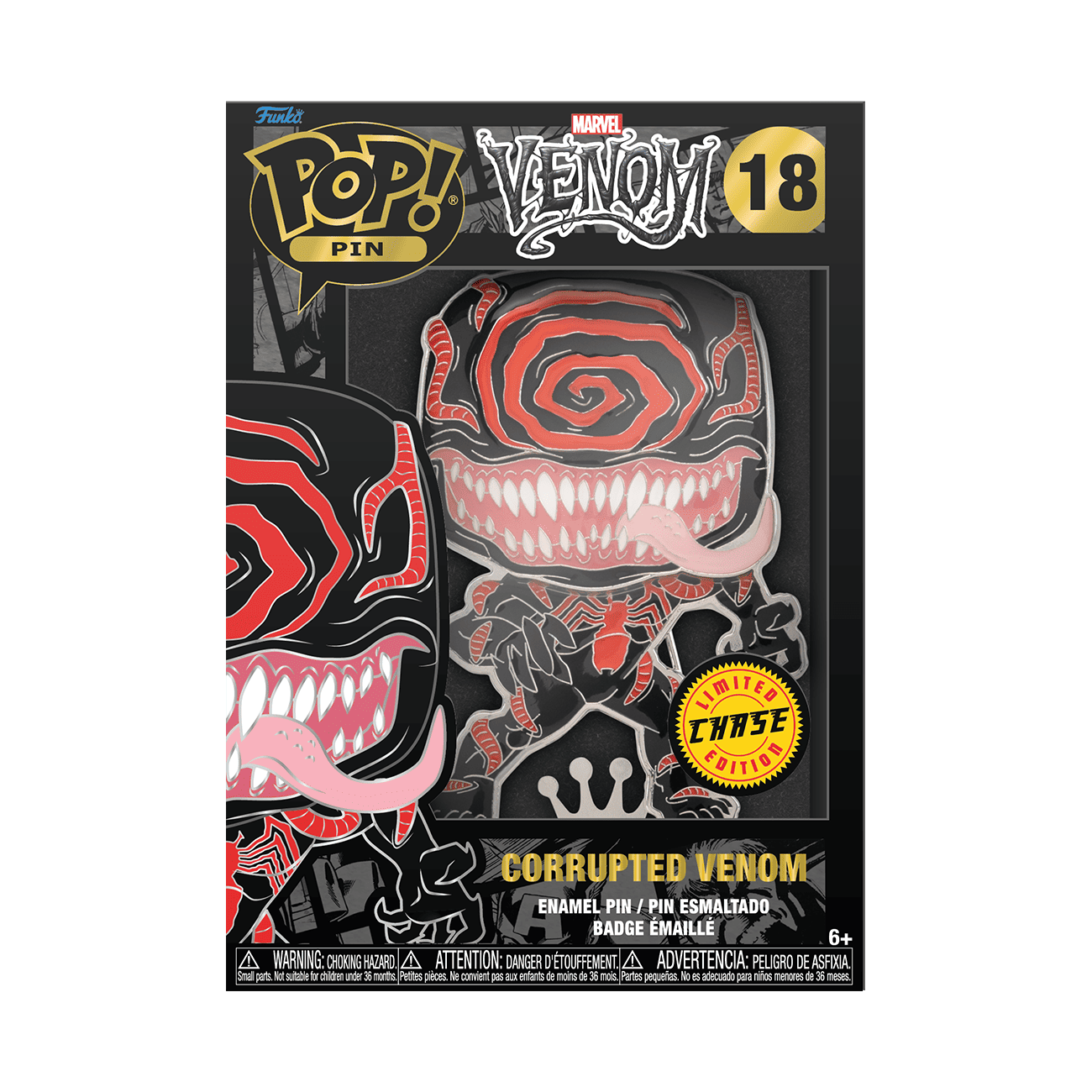 A bad host has corrupted the symbiote that latched onto it. The resulting Venom is unbridled and ready to pounce on any Marvel collection it comes across. Set Corrupted Venom loose into your Pop! Pin collection and see which one comes out the winner. The chase’s white teeth glow in the dark, and so does the red pattern on the forehead. Enamel pins are 4.15 in (10.5 cm) tall.