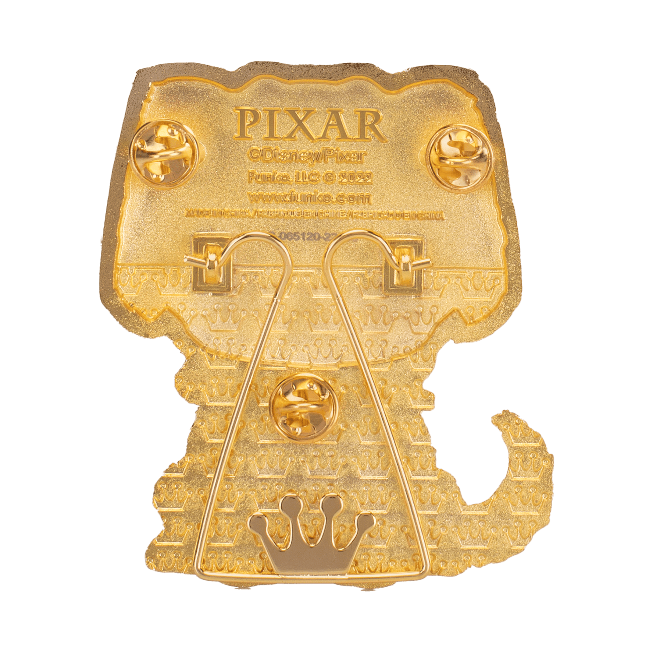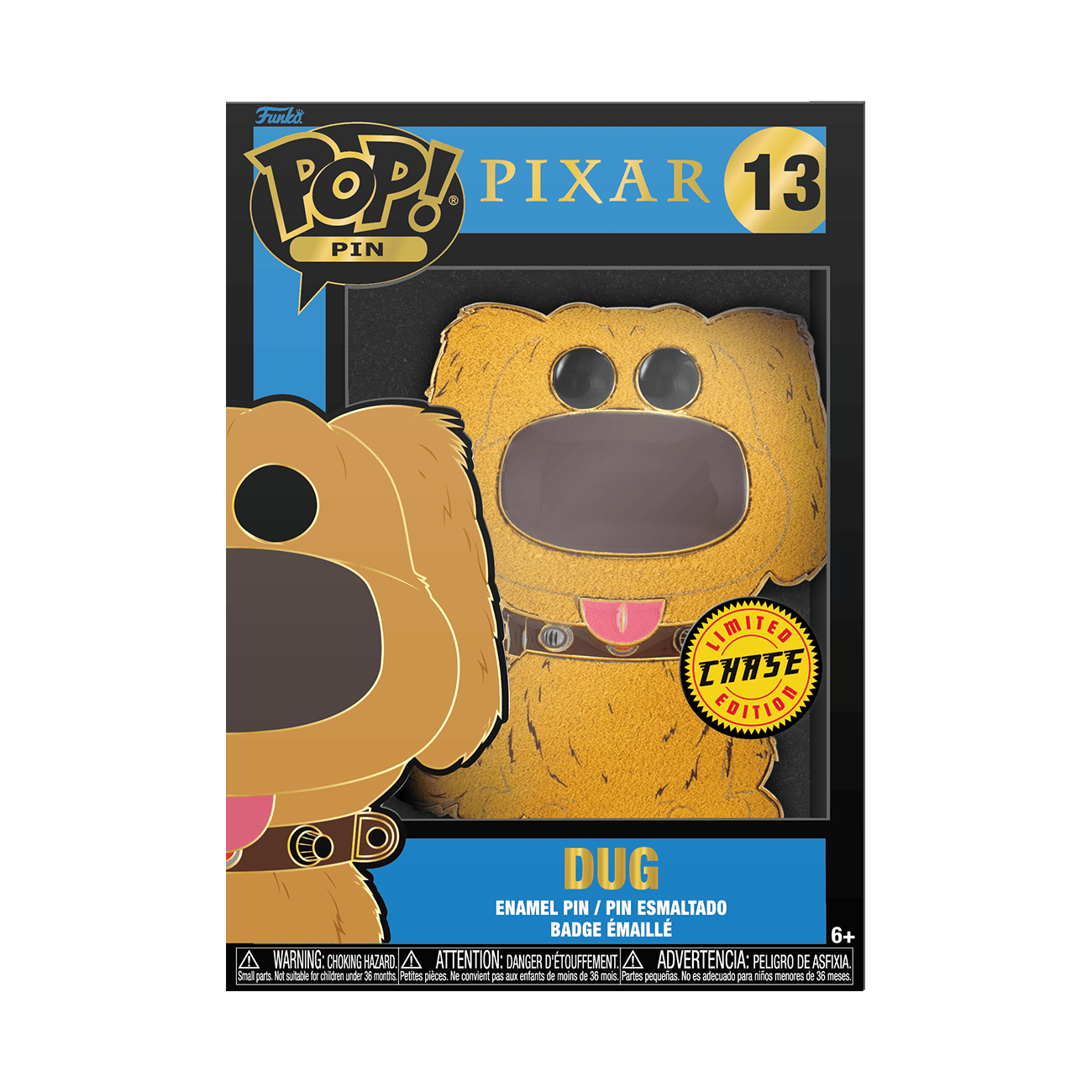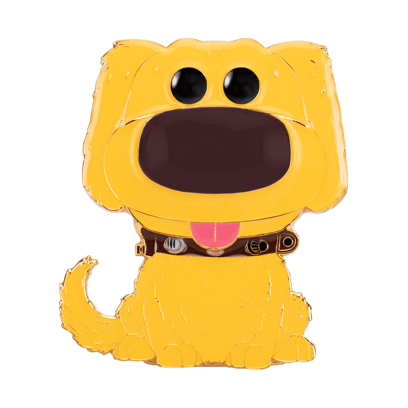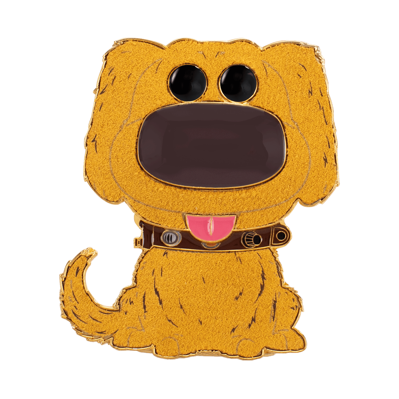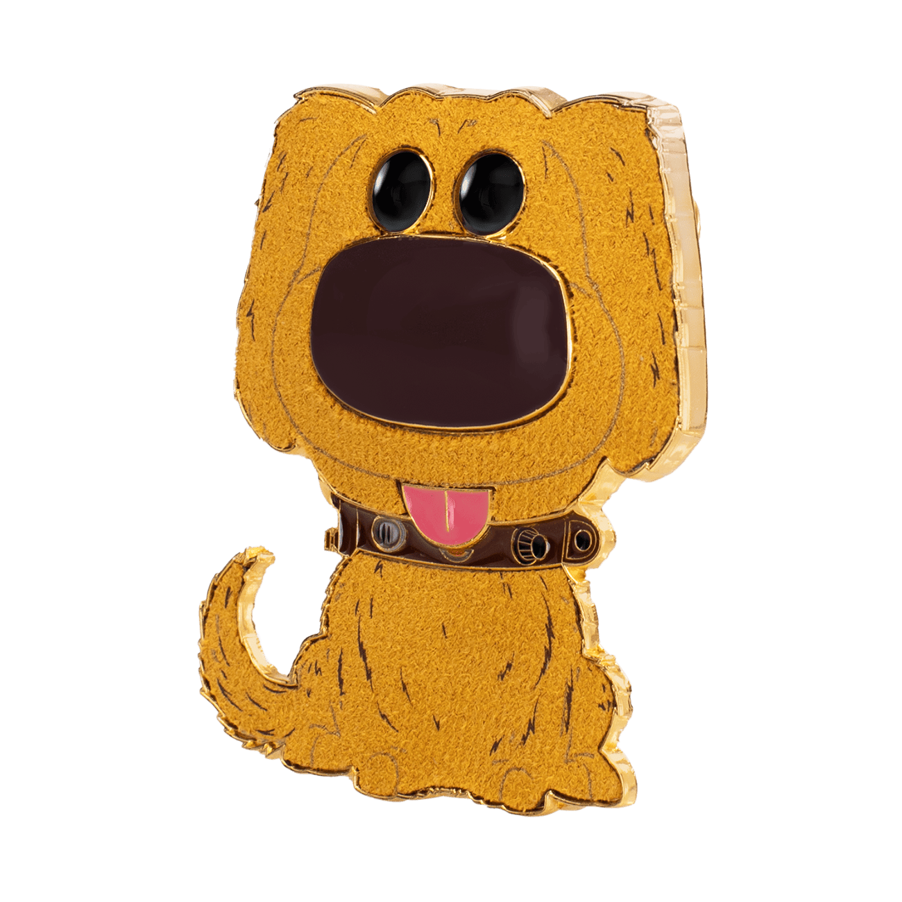 Squirrel spotter and trained tracker, the loveable Dug is ready to follow you home as a Loungefly Pixar Pop! Pin. Welcome Dug on your journeys—wherever they may take you. There's a 1 in 12 chance you may find the flocked chase variant. Pin features gold-colored hardware, and a built-in stand. Enamel pin is approximately 4 in (10.2 cm) tall.