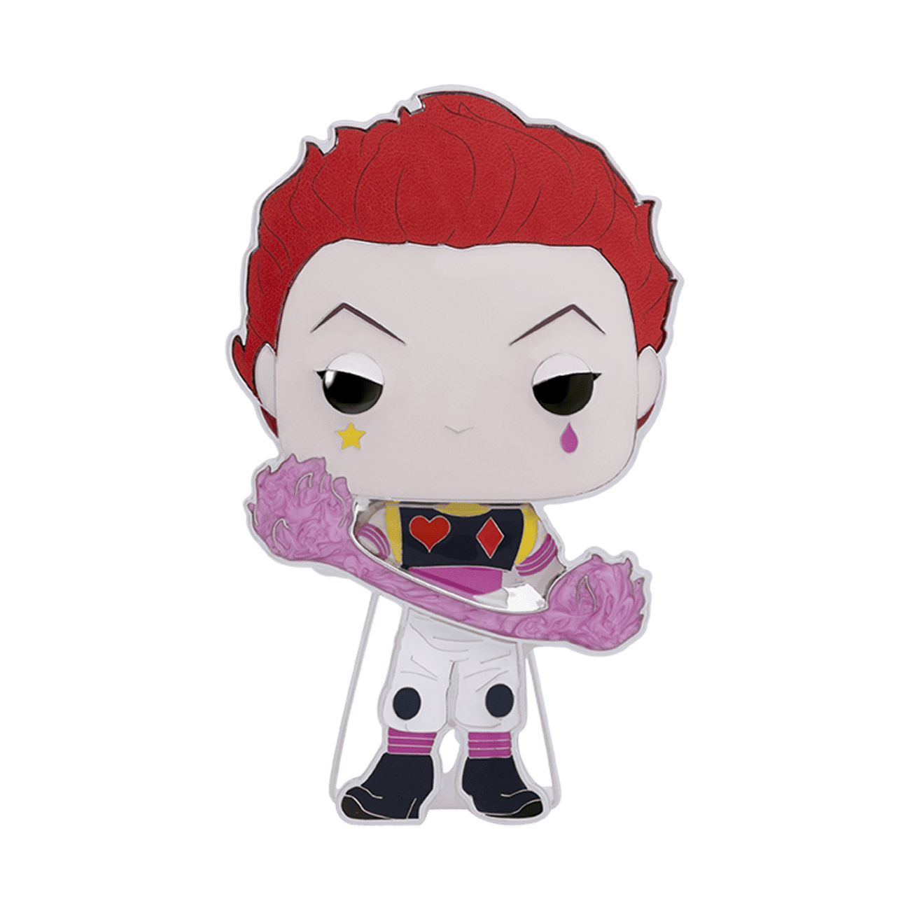 Hunting for adventure? Stick with Loungefly Funko Pop! Pin Hisoka, and adventurous fun won’t be much of a stretch. Pop! Pin Hisoka shows off his Nen ability with Bungee Gum. Join the hunt and expand your Hunter X Hunter set. Enamel pin features silver-colored hardware and a built-in stand. Pin is approximately 4 in (10.2 cm) tall.