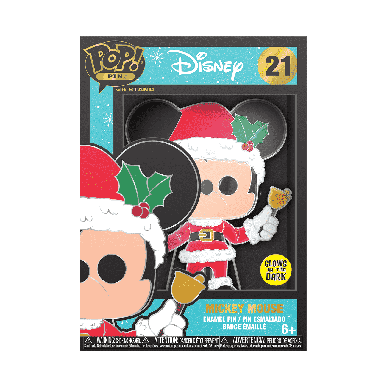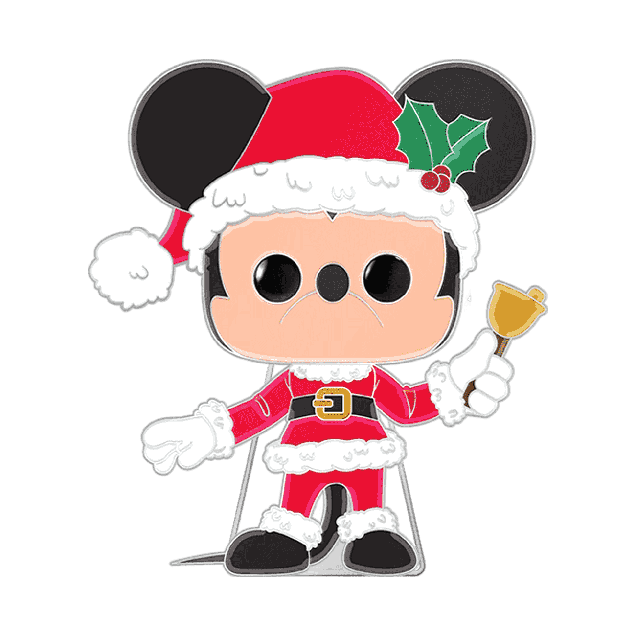 Mickey Mouse is here to ring in the season in his festive red and white suit! Embrace the spirit of the holidays by welcoming Loungefly Pop! Pin Mickey Mouse into your Disney classics collection. This Pop! Pin features glow-in-the-dark enamel fill, silver-colored hardware, and a built-in stand. Enamel pin is approximately 4 in (10.2 cm) tall.