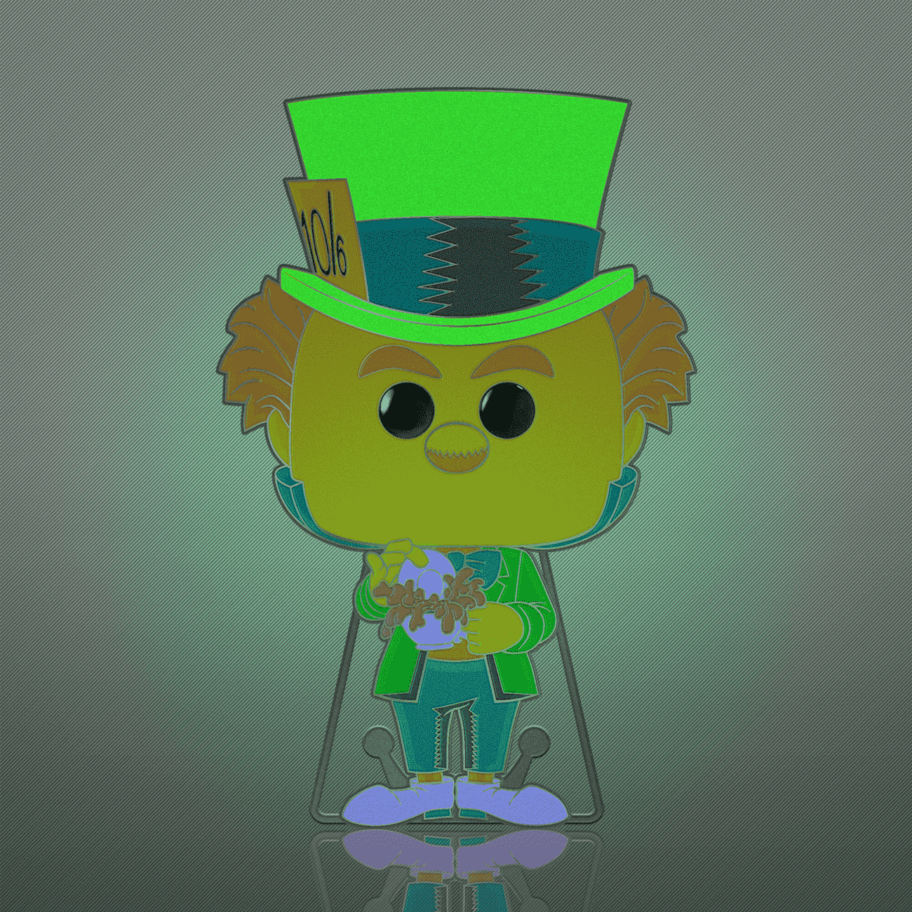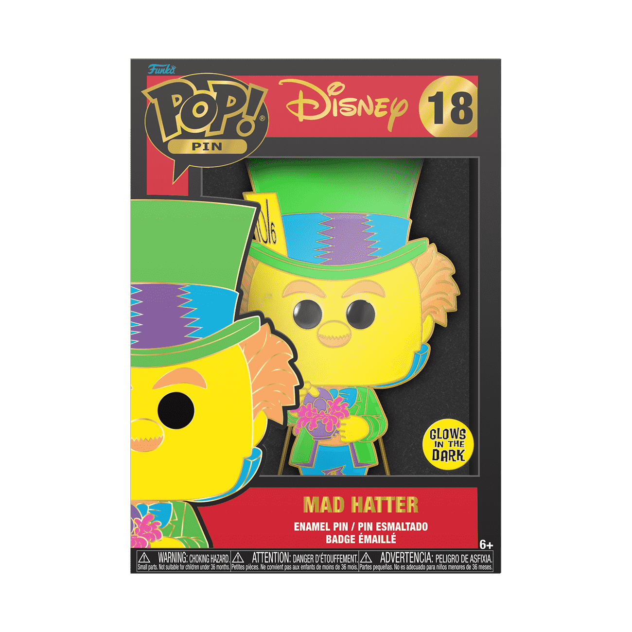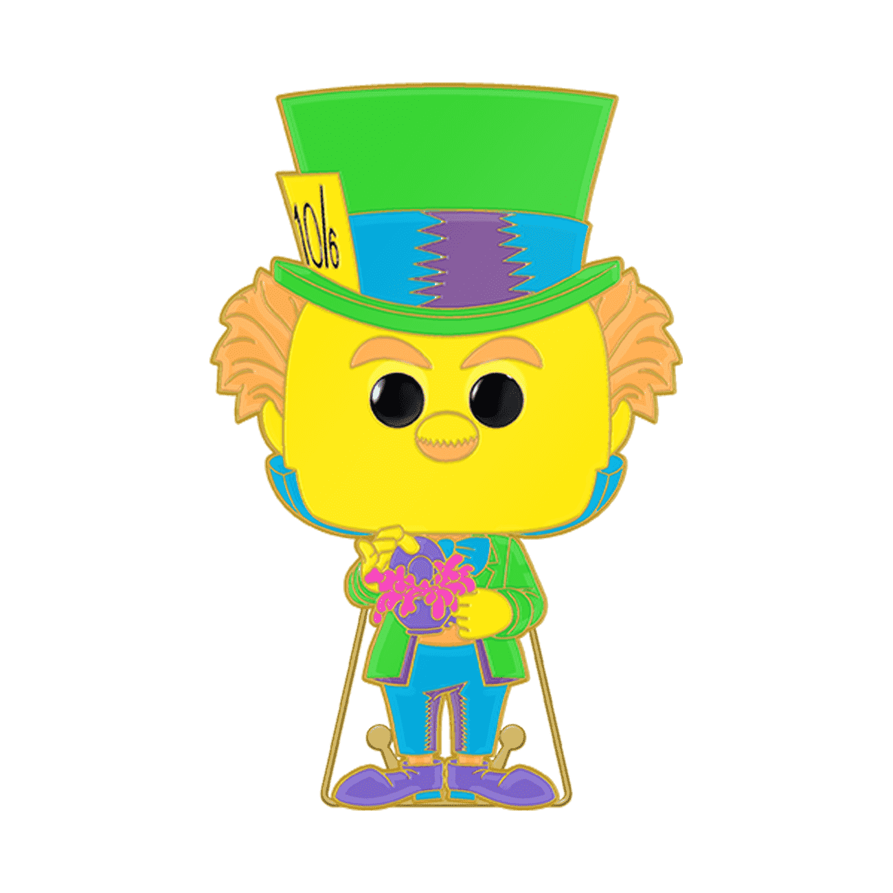 Stop by for a spot of tea with the Loungefly Pop! Pin Mad Hatter! He has arrived to celebrate a very merry unbirthday in your Alice in Wonderland collection! This glow-in-the-dark, black light Pop! Pin features gold-colored hardware and a built-in stand. Enamel pin is approximately 4 in (10.2 cm) tall.