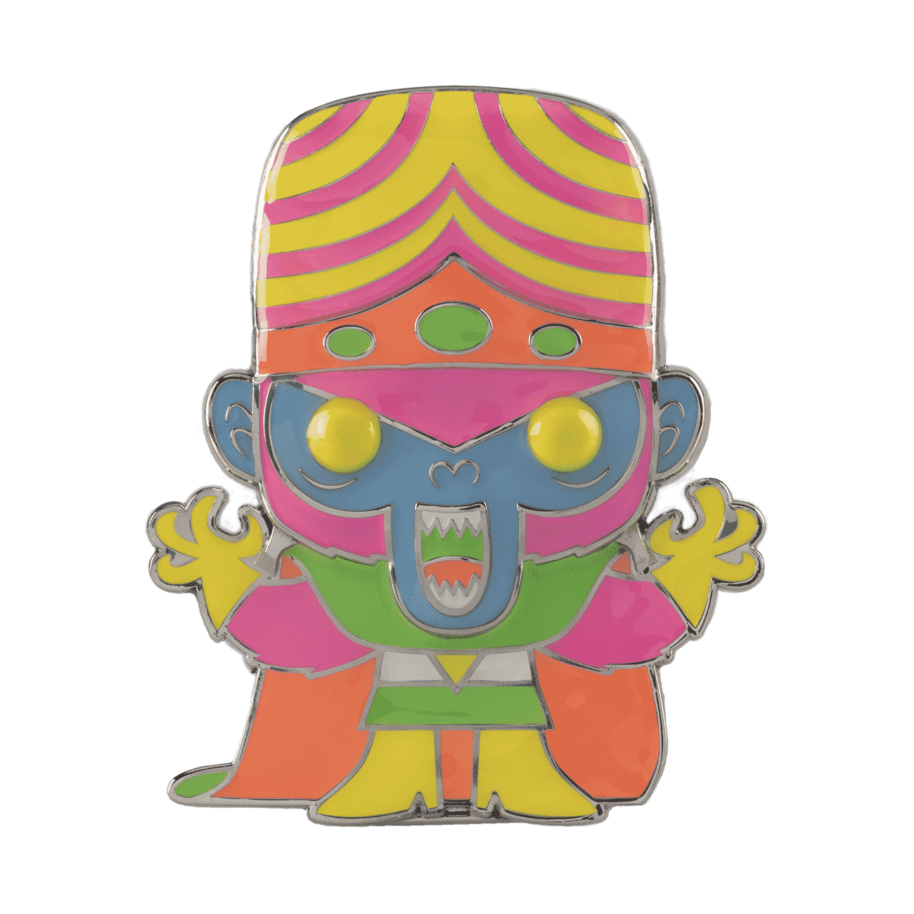 Loungefly Pop! Pin Mojo Jojo is here to execute his newest plan and infiltrate your The Powerpuff Girls collection. Will his plans be foiled by Professor Utonium, Blossom, Buttercup, and Bubbles? This glow-in-the-dark Pop! Pin features 3D molded metal, silver-colored hardware, and a built-in stand. There’s a 1 in 12 chance you may find the black light chase of Pop! Pin Mojo Jojo. Enamel pin is approximately 4 in (10.2 cm) tall.