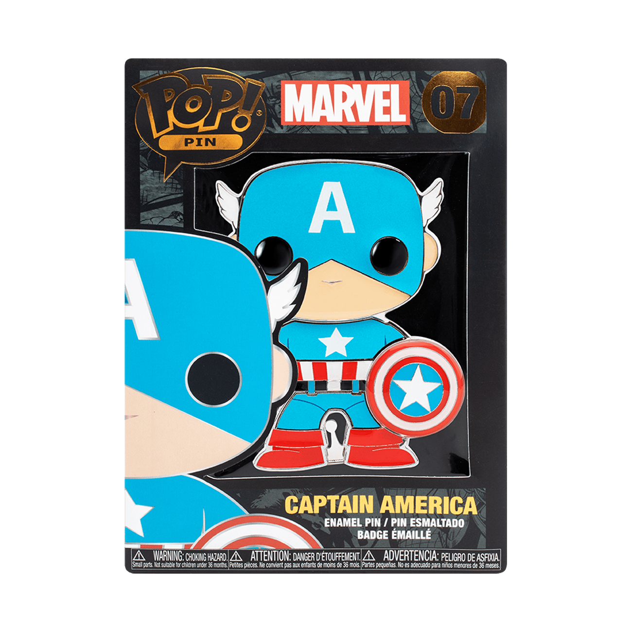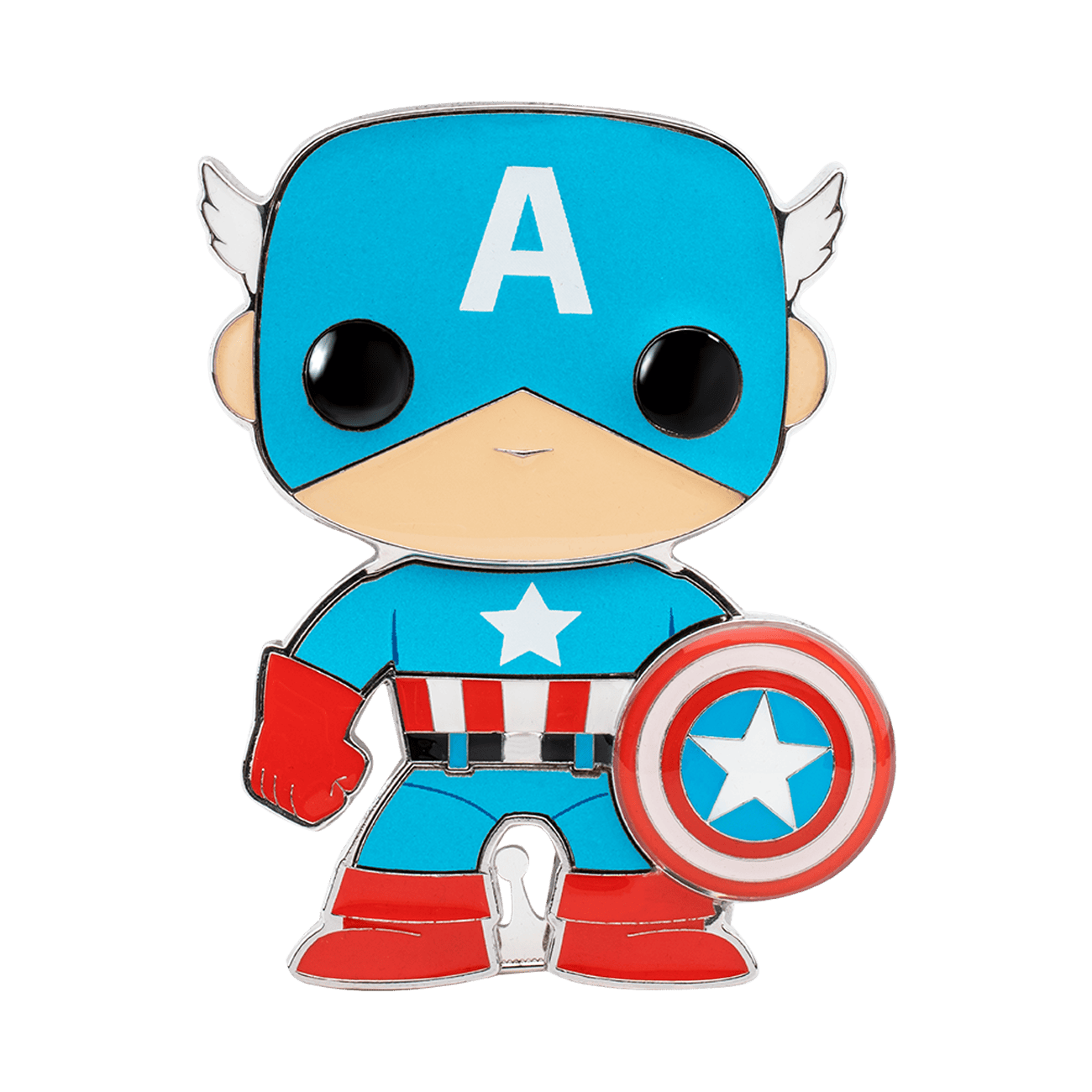 Show the world that you stand for freedom and liberty by adding Pop! Pin Captain America to your Marvel pin collection. Captain America is depicted in his classic costume, straight from the pages of Marvel Comics! Pin features an enamel fill on gold hardware, has a built-in stand, and is approximately 4 in (10.2 cm) tall.