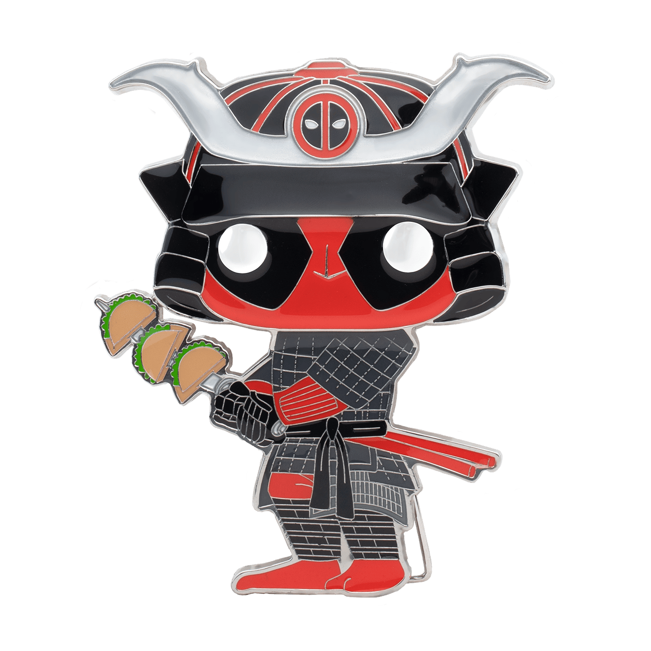 Pop! Pin Samurai Deadpool is here to stand beside King Deadpool and the rest of your Marvel collection. Pin features silver colored hardware, and a built-in stand. Enamel pin is approximately 4 in (10.2 cm) tall.