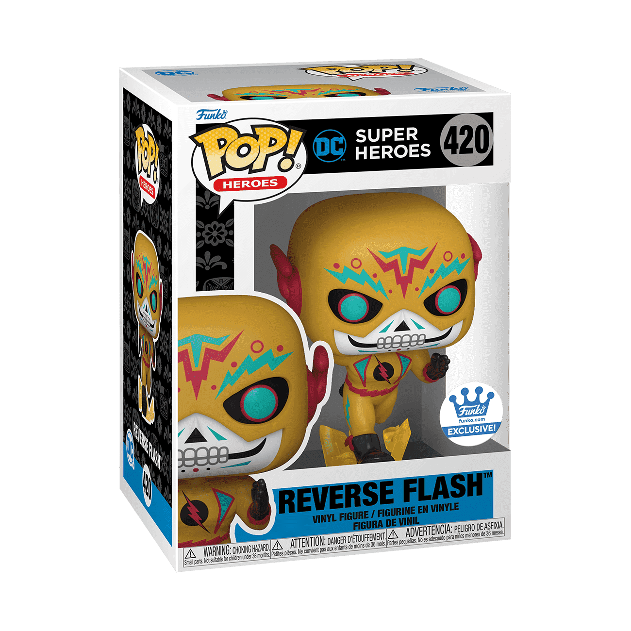 Crossing through time, with a colorful cultural twist, Reverse-Flash™ harnesses the past and the present, while zooming towards your DC collection. Add this exclusive Día De Los DC Reverse-Flash Pop! to your Pop! Heroes set before he has a chance to stop time. Vinyl figure is 3.81 in (9.7 cm) tall.