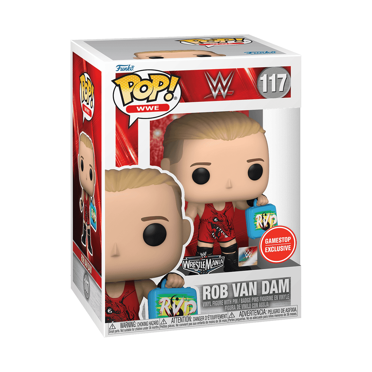 Turn your attention to the center of the ring, featuring GameStop-exclusive Pop! Rob Van Dam with the Money In The Bank briefcase! Exclusive Pop! Rob Van Dam comes with a Pop! Pin of the Wrestlemania logo. Welcome Pop! & Pin to the spotlight and add them to your Pop! WWE collection. Vinyl figure is approximately 3.81-inches tall. The 1.5-inch enamel-fill pin features sturdy silver-colored metal hardware.
