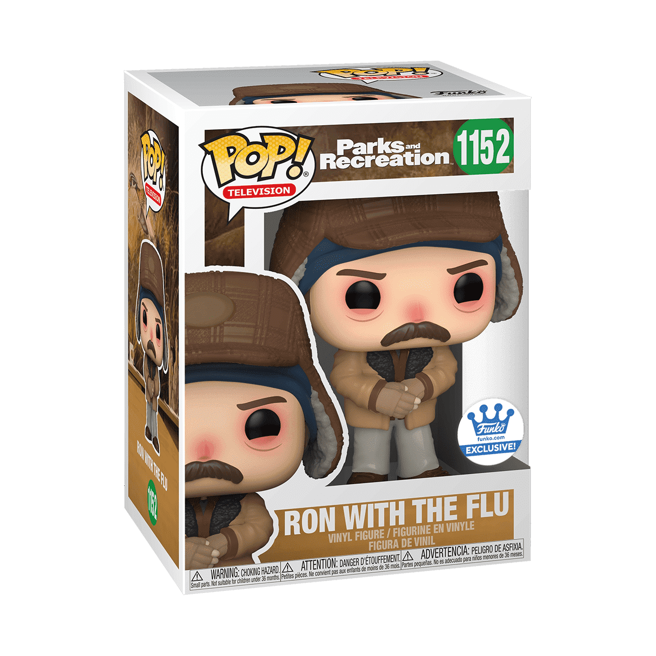 Ron Swanson is stern, stiff, and taking on his toughest battle yet…the flu. Ron Swanson is feeling very unlike himself, but your Parks and Recreation collection will love to have him as their boss all the same. Collect the Funko exclusive Pop! Ron with the Flu for your Parks and Recreation set. Vinyl figure is approximately 4.75 in (12.1 cm) tall.