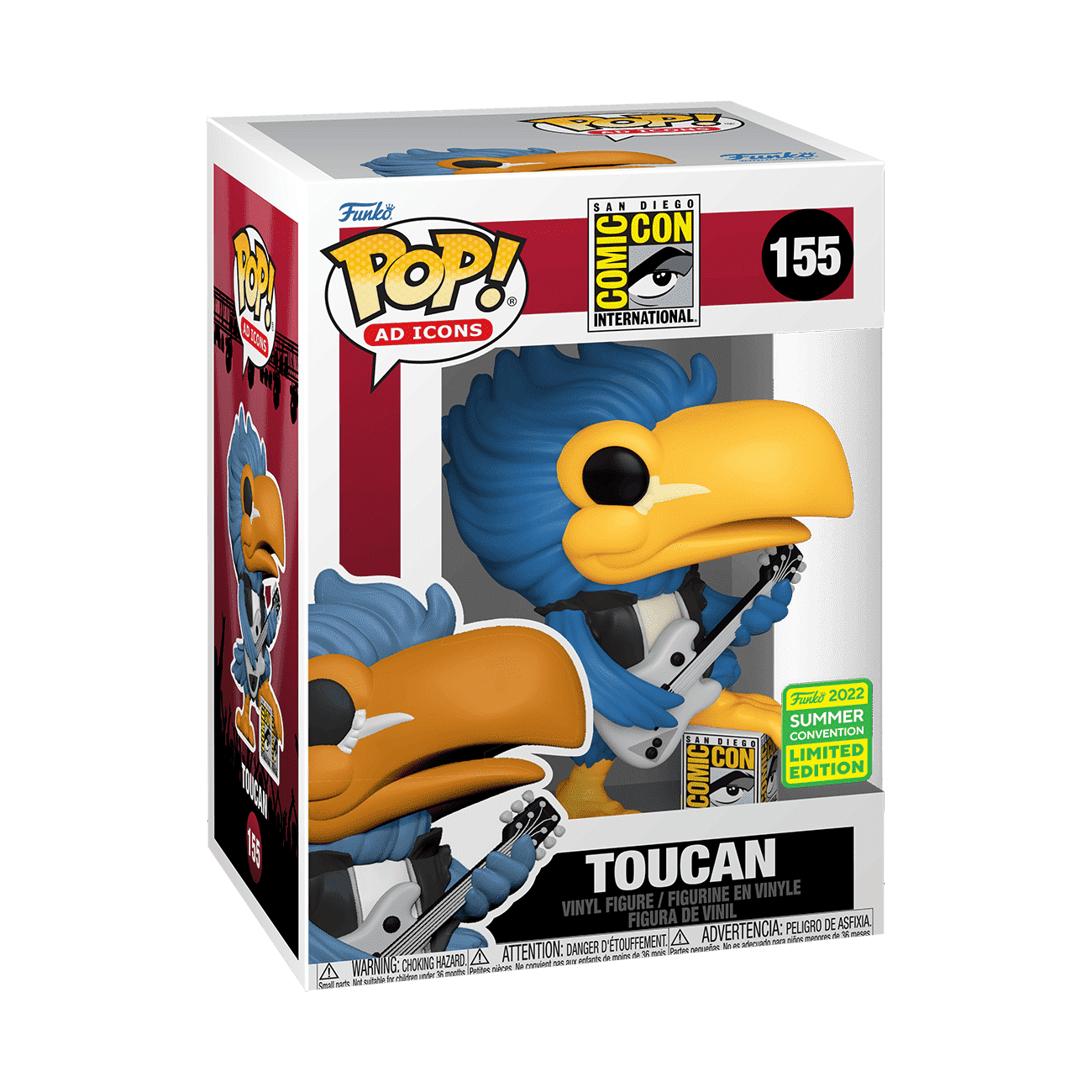 Rock out with Pop! Toucan, the loveable 2022 San Diego Comic-Con exclusive mascot. Pop! of Toucan holds an electric guitar and rests his foot on a San Diego Comic-Con International box. Capture Pop! Toucan for your Ad Icons collection. Vinyl figure is 4 in (10.2 cm) tall.