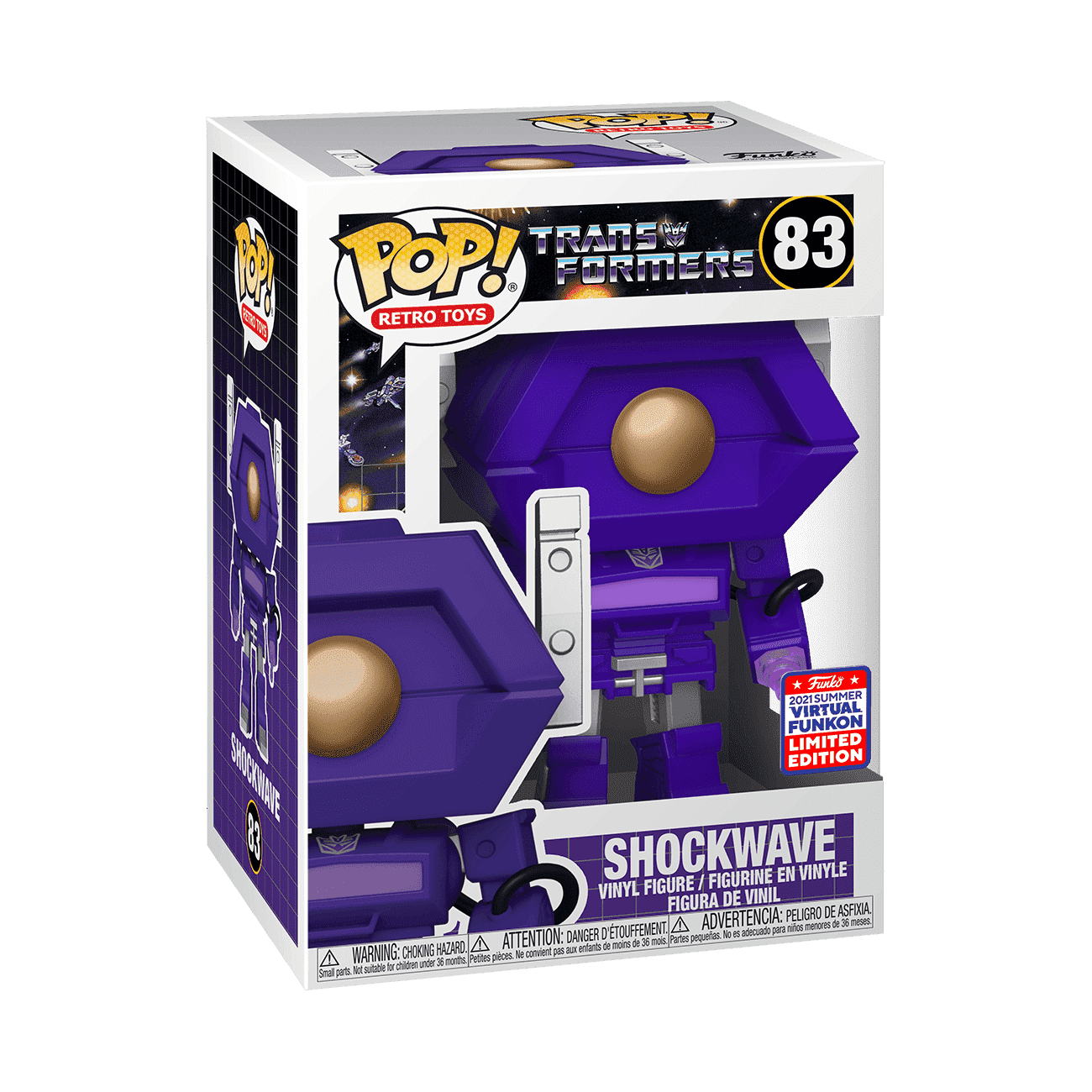 The modular toys of characters from the 1984 TV series The Transformers awed fans with the robot warriors from planet Cybertron that converted into various vehicles and objects. Shockwave is a scientist for the Decepticon robots lead by Megatron. The 2021 FunKon exclusive Pop! Shockwave is looking to join his fellow Decepticons, to battle against the Autobots in your retro toys and The Transformers collection. Vinyl figure is approximately 4.75 in (12.1 cm) tall. Please note: Product will have the 2021 FunKon sticker on the box. Customer may purchase up to one piece per household. This item does not qualify for discounts or promotions