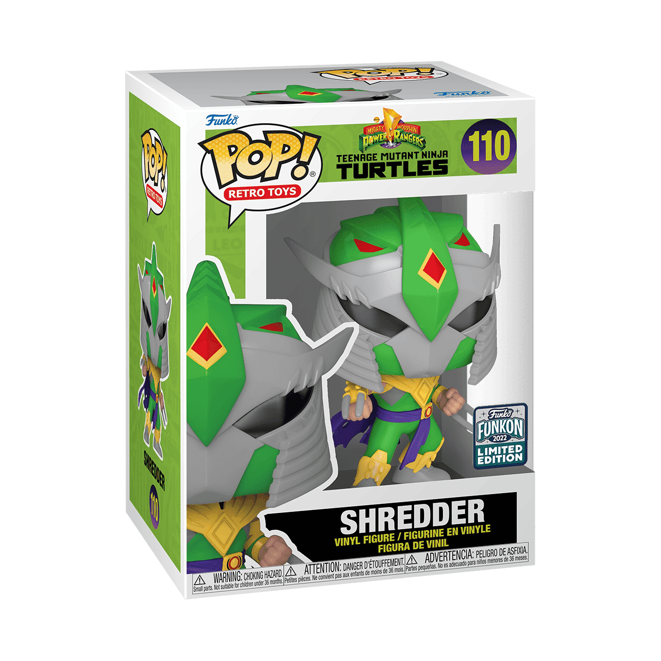 Shell shocking fun and excitement await you as the Teenage Mutant Ninja Turtles team up with the Mighty Morphin Power Rangers! Add this 2022 Funko FunKon exclusive collectible Pop! Shredder to your collection, though Splinter and the Teenage Mutant Ninja Turtles will be surprised to see him. Grow your Pop! Retro Toys collection today. Vinyl figure is approximately 4.18 in (10.6 cm) tall.