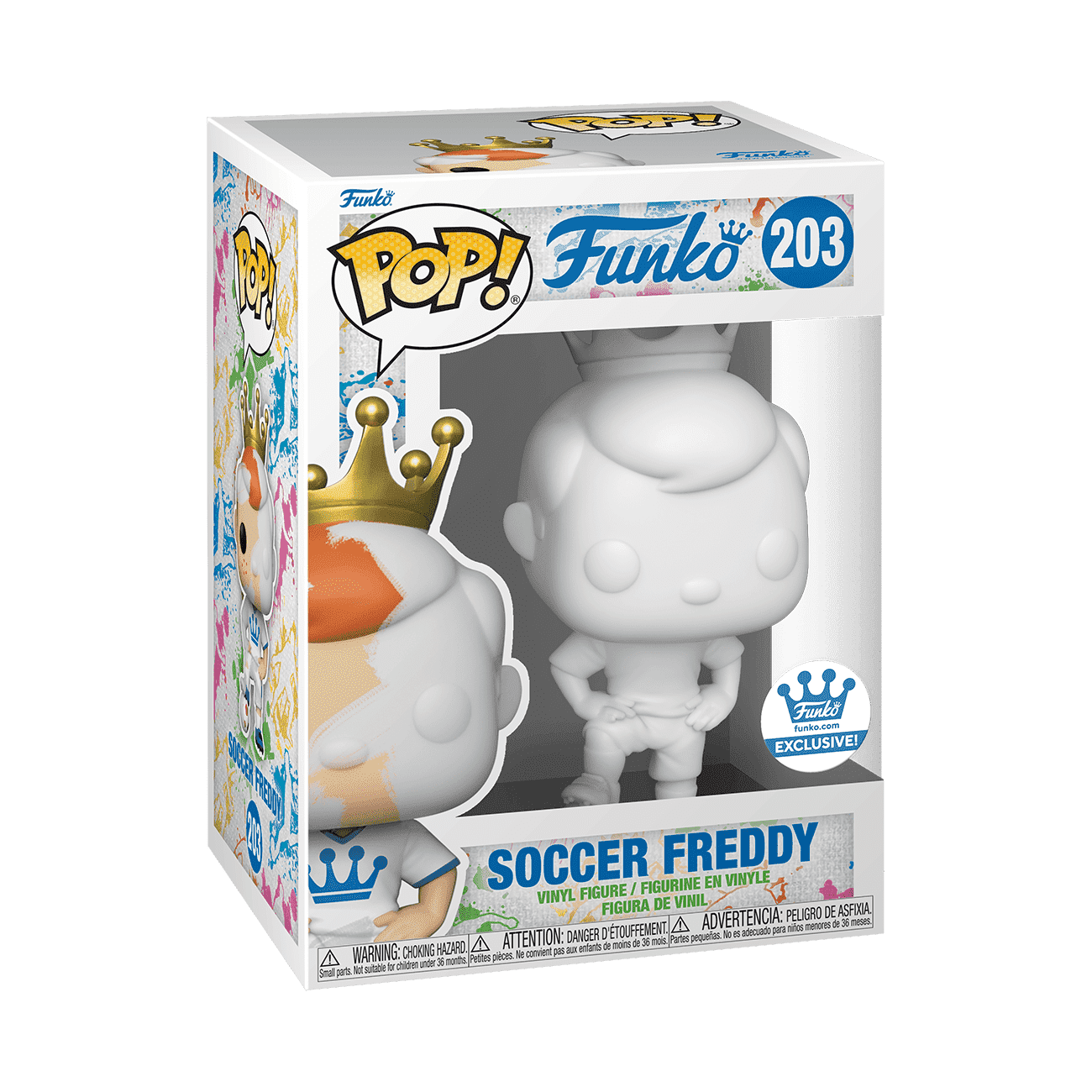 Score a goal with Pop! Soccer Freddy! Decorate this customizable D.I.Y. White Pop! with your favorite art medium and enjoy your own one-of-a-kind creation! This exclusive Pop! figure is perfect for designing your own team jersey and expanding your Freddy Funko collection! Vinyl figure is approximately 4.85 in (12.3 cm) tall.