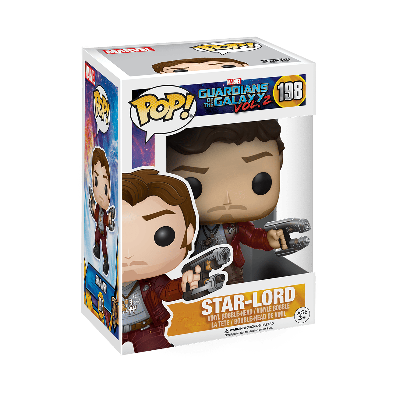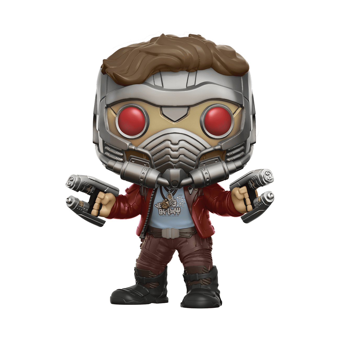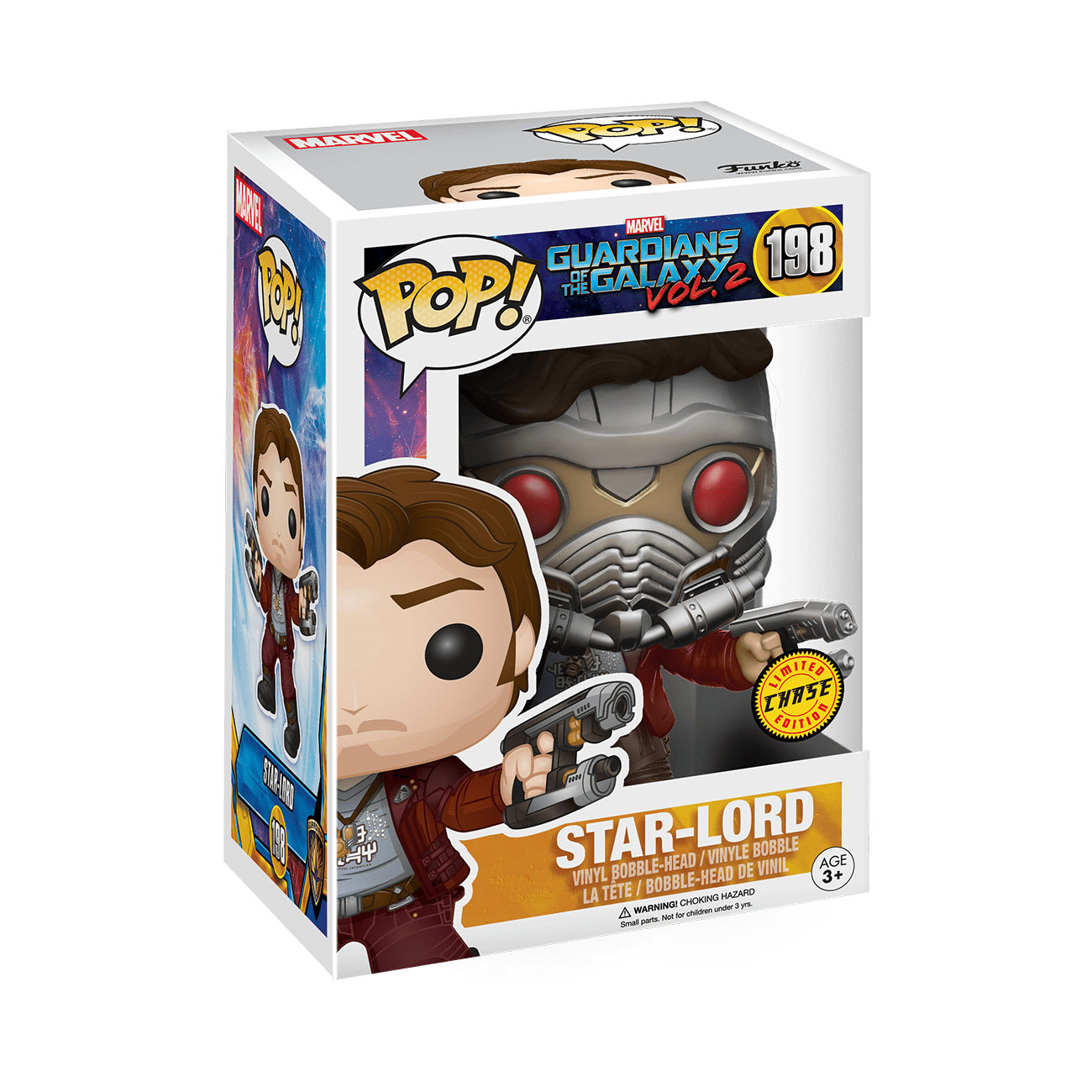 Your Marvel collection is about to go on a galactic adventure with the arrival of Pop! Star-Lord. There's even a 1 in 6 chance that you may find the chase of Pop! Star-Lord with his mask on. Vinyl bobblehead is approximately 4 in (10.2 cm) tall.