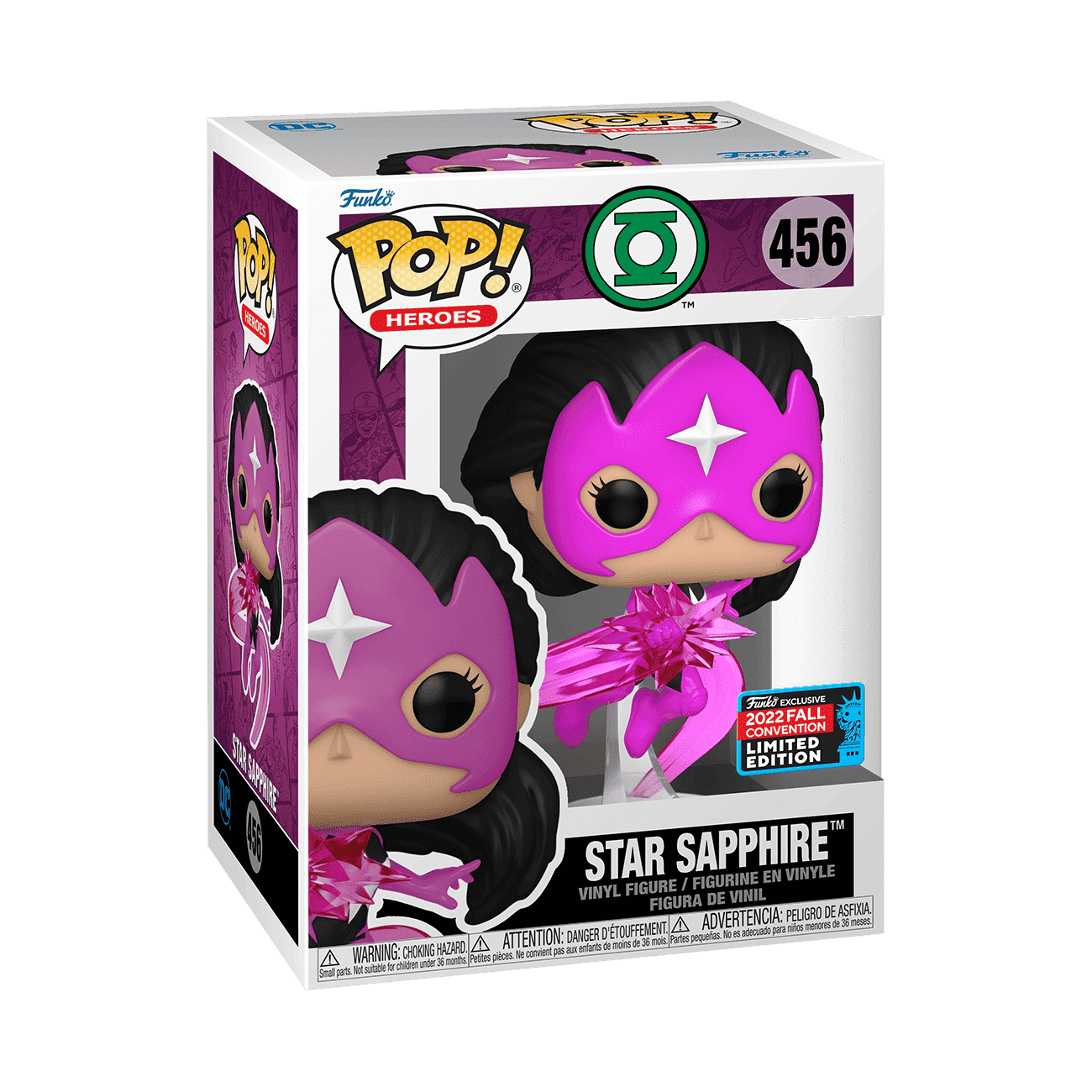 A bright burst of powerful energy wants to take over your DC Collection. This 2022 New York Comic-Con exclusive Pop! Star Sapphire™, equipped with the warrior spirit of the Zamarons™, wields the power of love in order to destroy. Protect against destructive forces by guarding Pop! Star Sapphire safely in your collection. Vinyl figure is approximately 4.49 in (11.4 cm) tall.