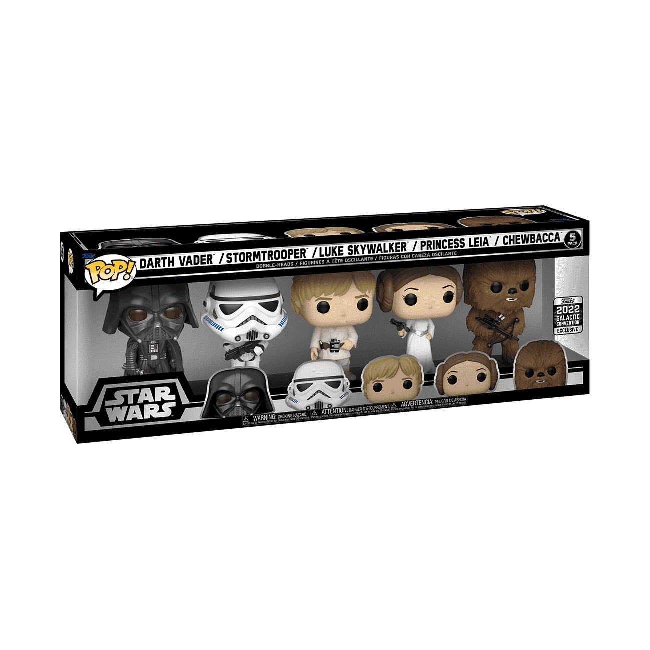 Celebrate a far-away galaxy of stellar characters with this Exclusive STAR WARS™ Pop! 5-Pack. This Pop! 5-Pack includes Pops! Darth Vader, Stormtrooper, Luke Skywalker, Princess Leia, and Chewbacca all together on a built-in stand. Vinyl bobblehead collectible is approximately 3.90-inches tall and 10.5-inches long.