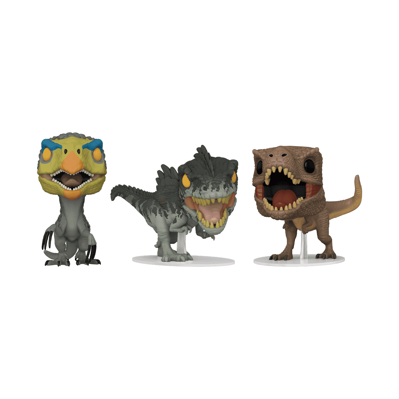 Big discoveries are roaring your way! Capture them with this exclusive Jurassic World Dominion 3-Pack of Pop! Therizinosaurus, Pop! Giganotosaurus, and Pop! T. Rex. They all wish to follow you home and play a big role in expanding your set. Vinyl figures are approximately 4 in (10.2 cm) tall.