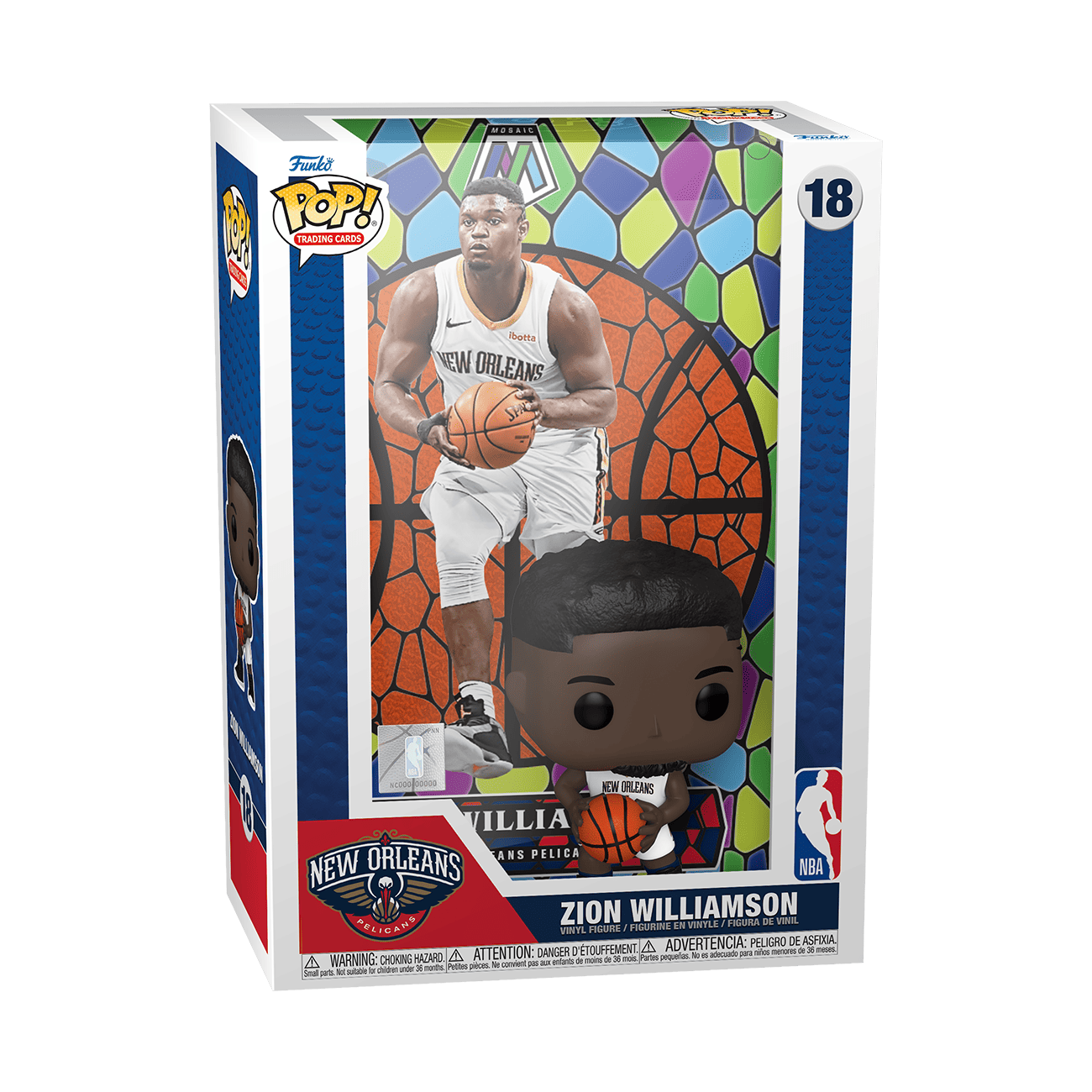 Commemorate an iconic sports trading card for your NBA collection with the exclusive Pop! Trading Card Zion Williamson. The collectible features a Pop! Zion Williamson figure, wearing his white New Orleans Pelicans uniform, which matches the included Panini Mosaic trading card art. This Pop! Trading Card comes prepackaged in a protective case that can be hung on your wall or displayed with your sports collection. Vinyl figure is approximately 4.1-inches tall. Approximate dimensions of protective case: 7.5”W x 10.5”H x 3.25”D