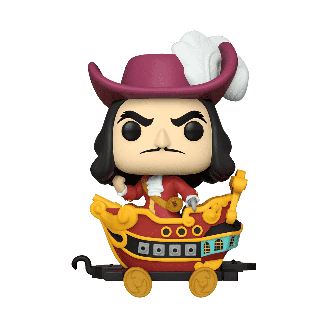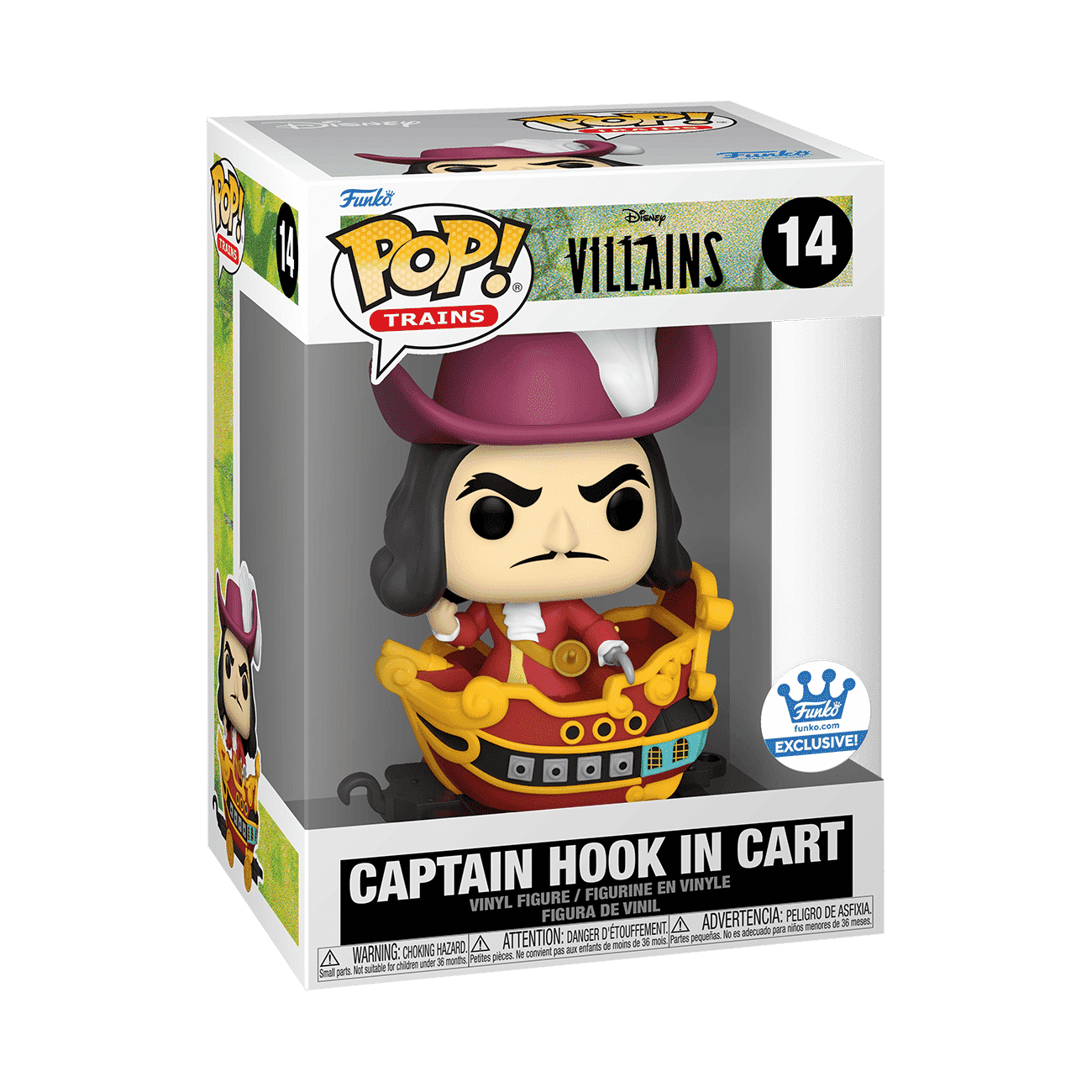 Funko exclusive Pop! Captain Hook stands on the deck, clenching his fist and scowling. Collect Pop! Captain Hook in Cart to lead your exclusive Disney Villains train. Vinyl figure is approximately 5.36-inches tall and 3.5-inches long.
