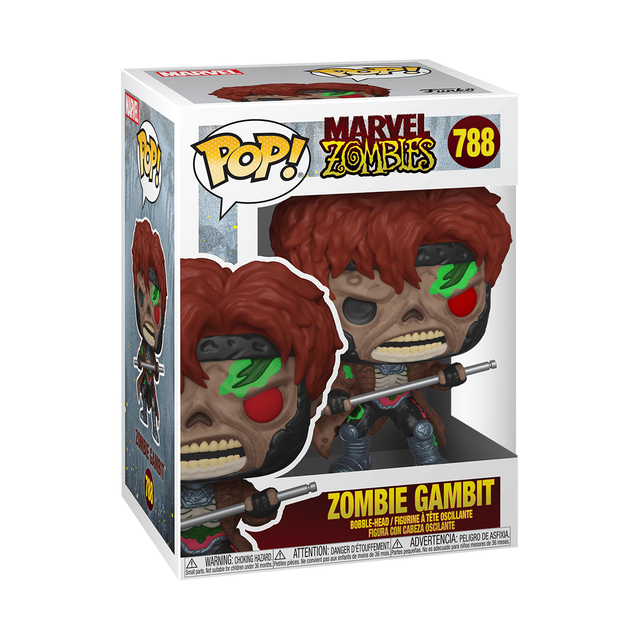 Consumed by their hunger, the Marvel Zombies have found a way to open a dimensional portal to find their way to new prey in your collection. There's no turning back for Pop! Zombie Gambit, he's ready to make an explosive entry into your Marvel Zombies collection. Vinyl bobblehead is approximately 4 in (10.2 cm) tall.