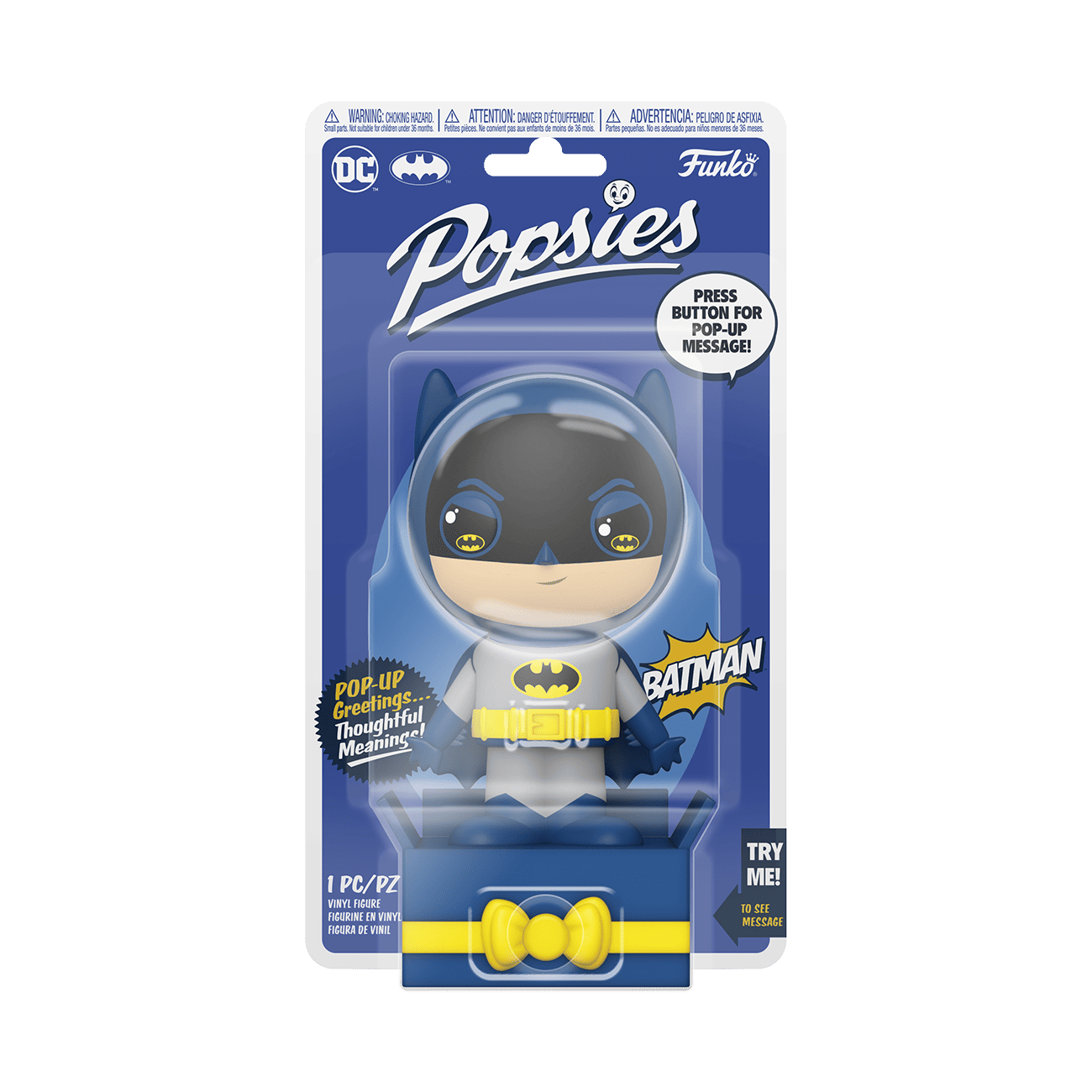 Surprise a friend or loved one with open arms and a pop up greeting with Popsies, the new collectible greeting by Funko! Press the center of the bow and the special message appears above Batman as he holds his arms out wide. You can even write who it's from and for with a permanent marker on the present's label. Share a sentiment and a smile with an awesome Popsies DC SUPER FRIENDS Batman! Vinyl collectible greeting is approximately 4.75 in (12.1 cm) tall. Warning: Not for children under the age of 3 years old.