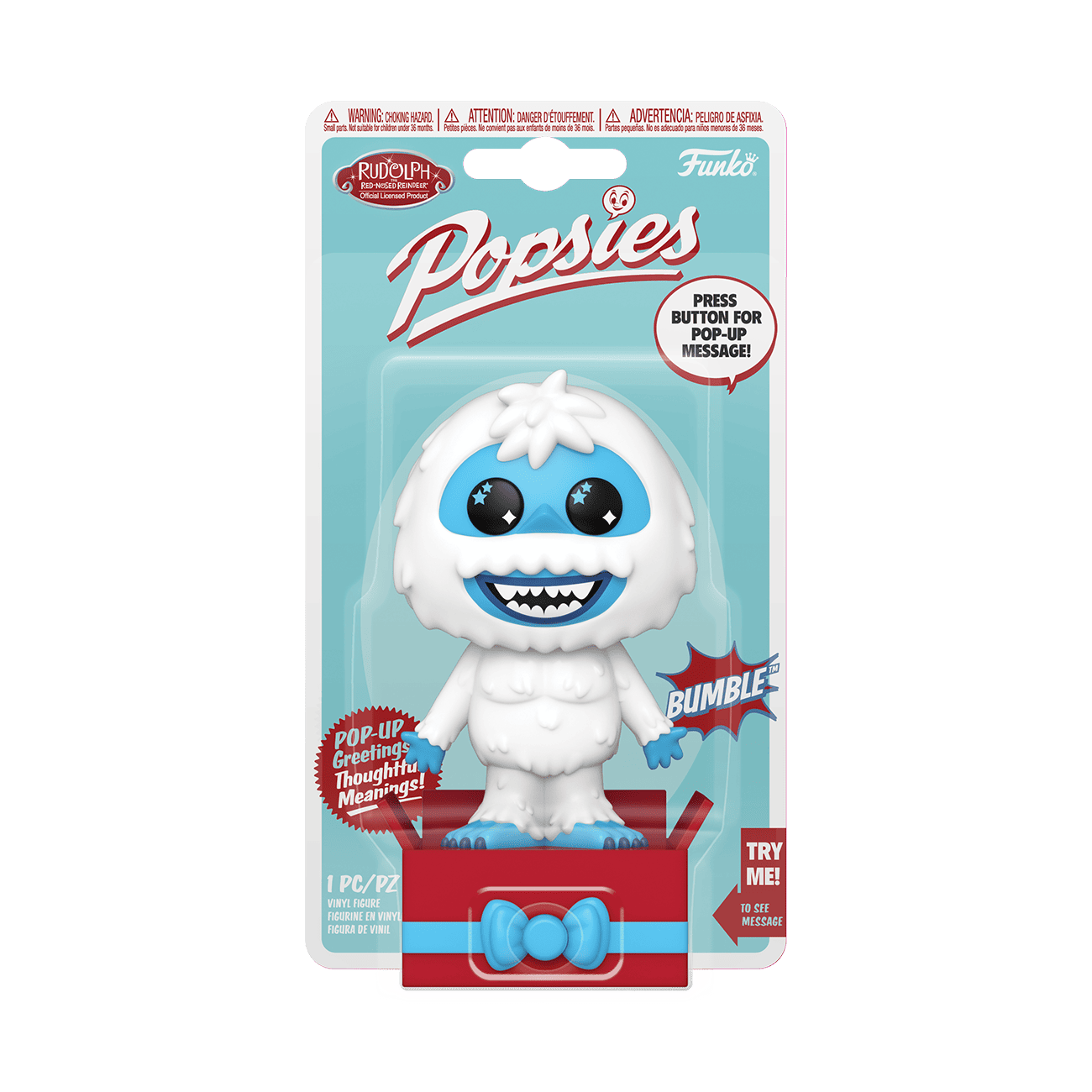 Surprise a friend or loved one with open arms and a pop-up greeting with Popsies, the new collectible greeting by Funko! Press the center of the bow and the special message appears above Bumble as he holds his arms out wide. You can even write who it's from and for with a permanent marker on the present's label. Share a sentiment and a smile with an awesome Popsies Bumble from Rudolph the Red-Nosed Reindeer Vinyl collectible greeting is approximately 4.75 in (12.1 cm) tall.