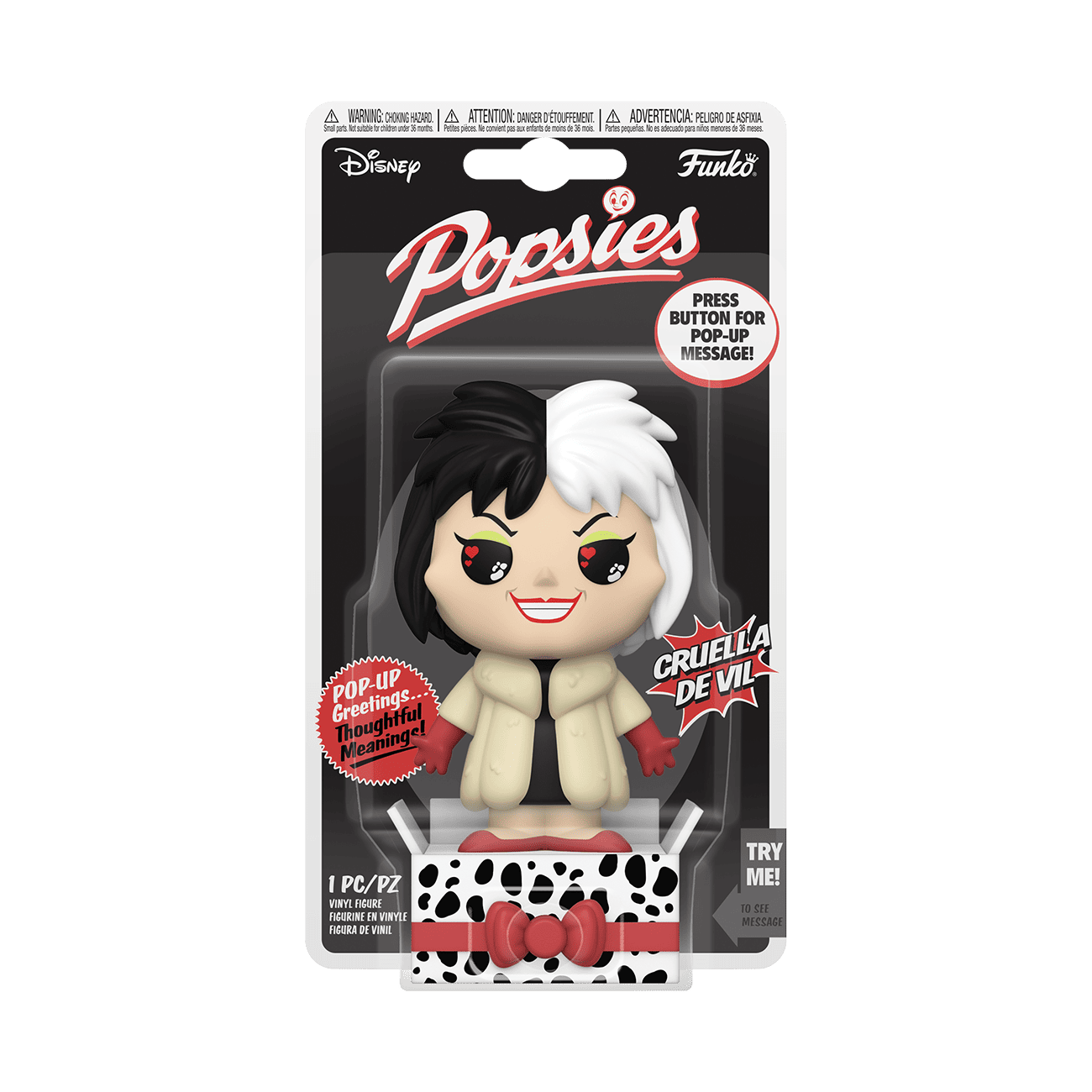 Surprise a friend or loved one with open arms and a pop-up greeting with Popsies, the new collectible greeting by Funko! Press the center of the bow, and the special message appears above Cruella de Vil as she holds her fur-coat covered arms out wide, ready for a big hug. You can even write who it's from, and for, with a permanent marker on the present's label. Share a devilishly fun sentiment and a smile with an awesome Popsies Disney Villains Cruella de Vil! Vinyl collectible greeting is approximately 5 in (12.7 cm) tall.