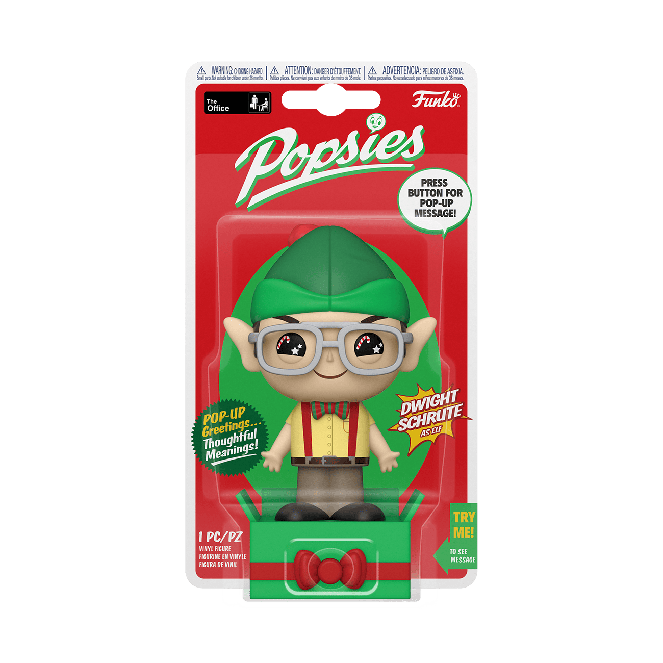 Surprise a friend or loved one with open arms and a pop-up greeting with Popsies, the new collectible greeting by Funko! Press the center of the bow and the special message appears above Dwight Schrute, as an elf, as he holds his arms out wide. You can even write who it's from and for with a permanent marker on the present's label. Share a sentiment and a smile with an awesome Popsies of Dwight Schrute from The Office Vinyl collectible greeting is approximately 4.75 in (12.1 cm) tall.