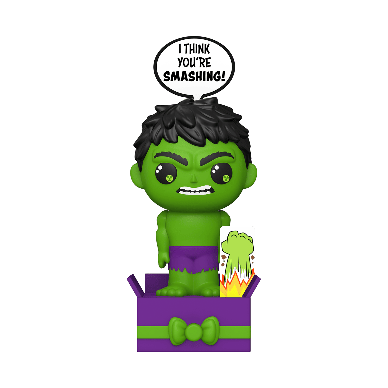 Surprise a friend or loved one with open arms and a pop-up greeting with Popsies, the new collectible greeting by Funko! Press the center of the bow and the special message appears above the Hulk, while another fun, punchy message appears below. You can even write who it's from and for with a permanent marker on the present's label. Share a sentiment and a smile with an awesome Marvel Hulk Popsies! Vinyl collectible greeting is approximately 4.75 in (12.1 cm) tall.