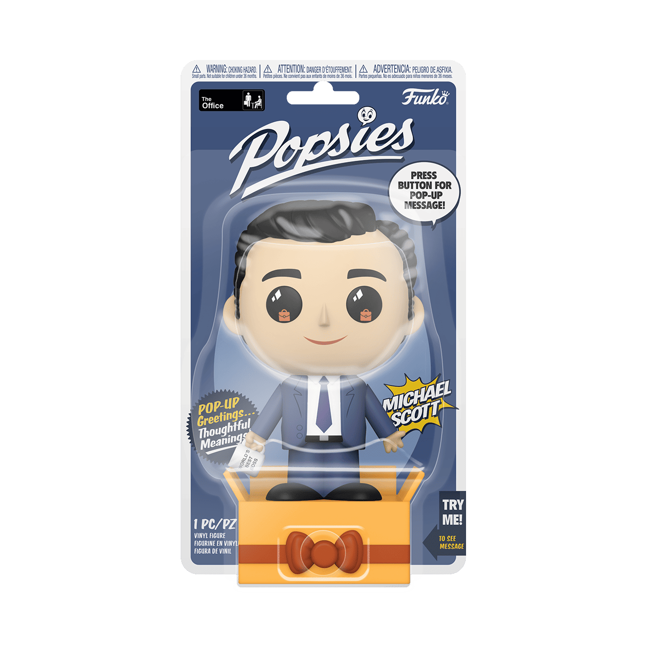 Surprise a friend or loved one with open arms and a pop up greeting with Popsies, the new collectible greeting by Funko! Press the center of the bow and the special message appears above Michael as he holds his arms out wide. You can even write who it's from and for with a permanent marker on the present's label. Share a sentiment and a smile with an awesome Popsies Michael Scott! Vinyl collectible greeting is approximately 4.75 in (12.1 cm) tall. Warning: Not for children under the age of 3 years old.