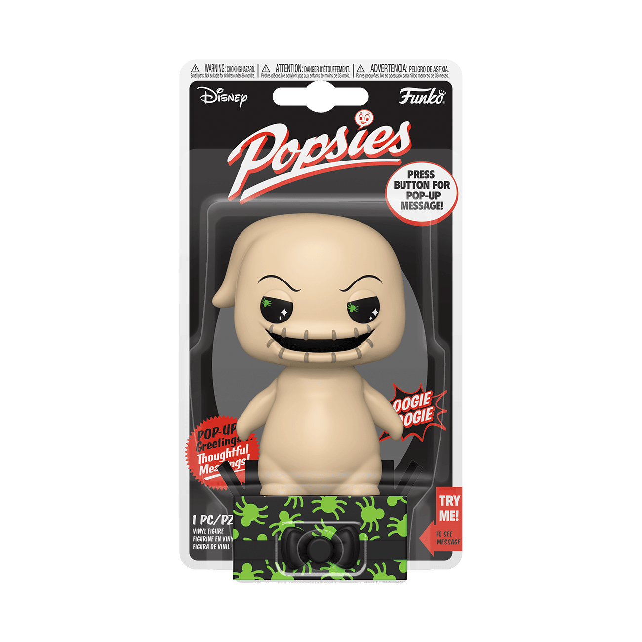 Surprise a friend or loved one with open arms and a pop-up greeting with Popsies, the new collectible greeting by Funko! Press the center of the bow and the special message appears above Oogie Boogie as he holds his arms out wide. You can even write who it's from and for with a permanent marker on the present's label. Share a sentiment and a smile with an awesome Popsies Oogie Boogie from Tim Burton’s The Nightmare Before Christmas.