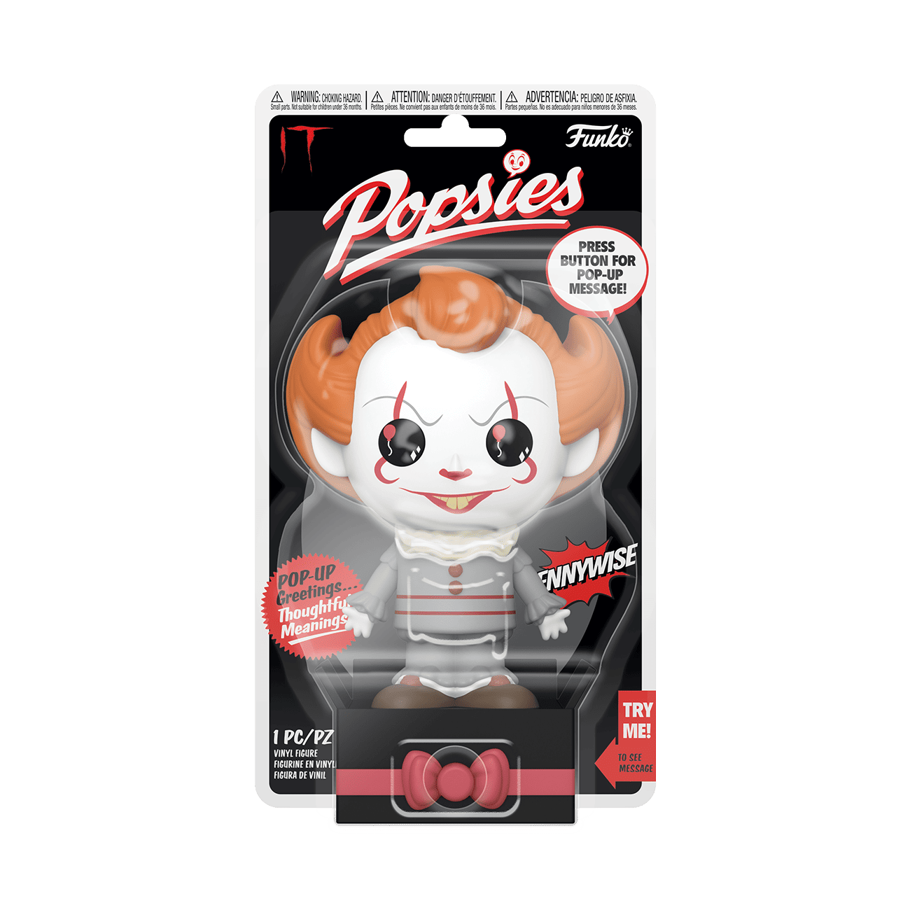 Surprise a friend or loved one with open arms and a pop up greeting with Popsies, the new collectible greeting by Funko! Press the center of the bow and the special message appears above Pennywise as he holds his arms out wide. You can even write who it's from and for with a permanent marker on the present's label. Share a sentiment and a smile with an awesome Popsies Pennywise! Vinyl collectible greeting is approximately 5 in (12.7 cm) tall. Warning: Not for children under the age of 3 years old.