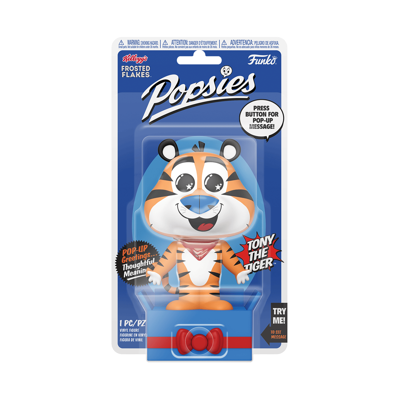 Surprise a friend or loved one with open arms and a pop up greeting with Popsies, the new collectible greeting by Funko! Press the center of the bow and the special message appears above Tony as he holds his arms out wide. You can even write who it's from and for with a permanent marker on the present's label. Share a sentiment and a smile with an awesome Popsies Tony the Tiger! Vinyl collectible greeting is approximately 5 in (12.7 cm) tall. Warning: Not for children under the age of 3 years old.