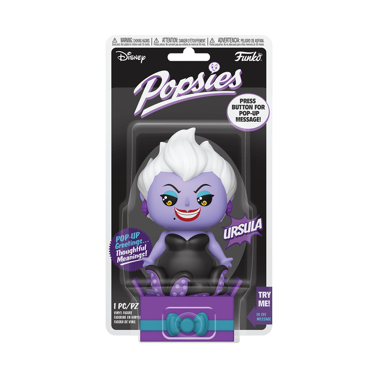 Surprise a friend or loved one with open arms and a pop-up greeting with Popsies, the new collectible greeting by Funko! Press the center of the bow and the special message appears above Ursula as she holds her arms out wide. You can even write who it's from and for with a permanent marker on the present's label. Share a sentiment and a smile with an awesome Disney Villains Ursula Popsies! Vinyl collectible greeting is approximately 4.75 in (12.1 cm) tall.