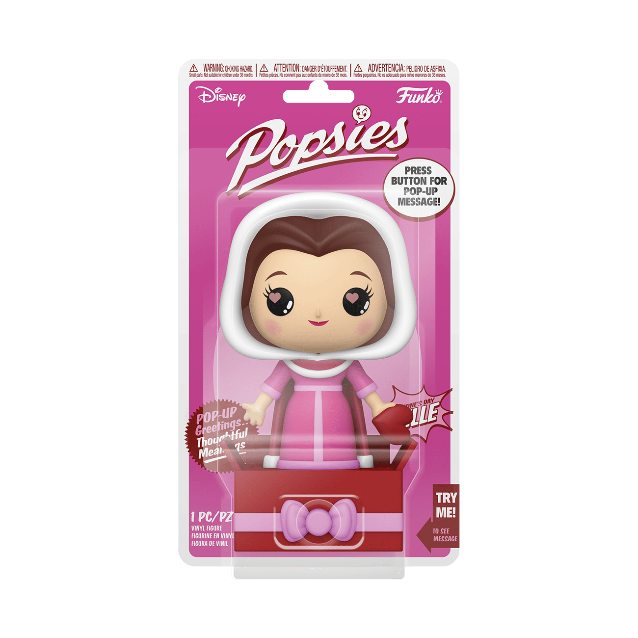 Surprise a friend or loved one with open arms and a pop up greeting with Popsies, the new collectible greeting by Funko! Press the center of the bow and the special message appears above Belle as she holds her arms out wide. You can even write who it's from and for with a permanent marker on the present's label. Share a sentiment and a smile with an awesome Popsies Valentine's Day Edition Belle! Vinyl collectible greeting is approximately 5 in (12.7 cm) tall. Warning: Not for children under the age of 3 years old.