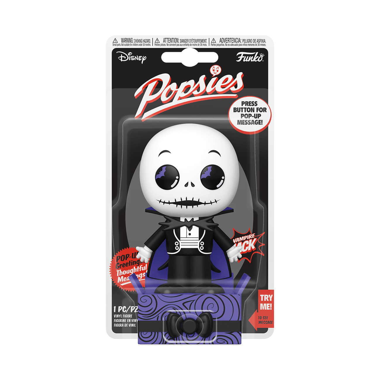 Surprise a friend or loved one with open arms and a pop-up greeting with Popsies, the new collectible greeting by Funko! Press the center of the bow and the special message appears above Jack Skellington, dressed as a vampire, as he holds his arms out wide. You can even write who it's from and for with a permanent marker on the present's label. Share a sentiment and a smile with an awesome Popsies of Disney, Tim Burton’s The Nightmare Before Christmas Jack Skellington!