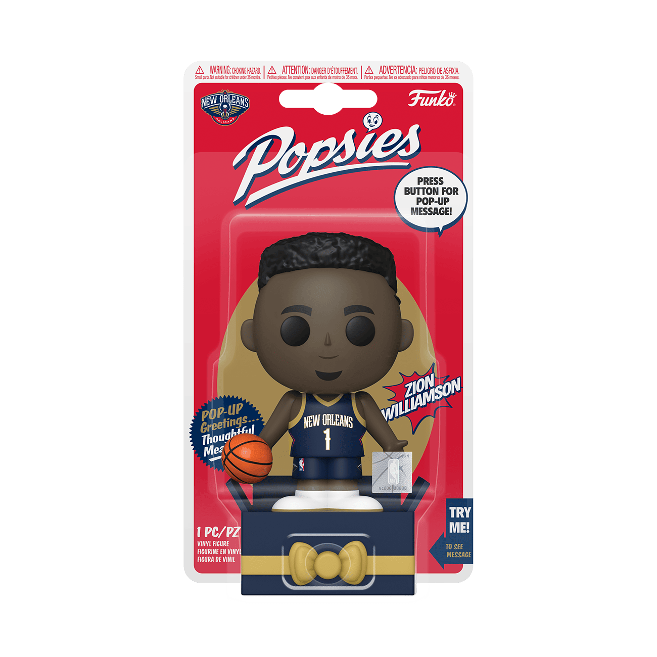 Surprise a friend or loved one with open arms and a pop-up greeting with POPsies, the new collectible greeting by Funko! Press the center of the bow, and the special message appears above the New Orleans Pelicans basketball player Zion Williamson as he holds his arms out wide, with a basketball in hand. You can even write who it's from and for with a permanent marker on the present's label. Share a sentiment and a smile with an awesome POPsies NBA collectible! Vinyl collectible greeting is approximately 5 in (12.7 cm) tall.