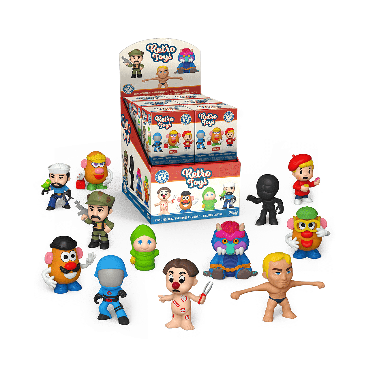 It's a blast from the past with this Retro Toys Mystery Mini collection. Bring some fun back into your every day life with these miniatures of recognizable Retro Toys. Gift them to a friend for a mystery surprise. Which toy do you vividly remember from your childhood? There's Cobra Commander, Play-doh Pete, Leatherneck, Snake Eyes, Shipwreck, My Pet Monster, Glo Worm, Stretch Armstrong, Cavity Sam, Mrs. Potato Head, and two versions of Mr. Potato Head. Vinyl figures range in height, depending on the character; maximum 2.75 in (7 cm) tall.