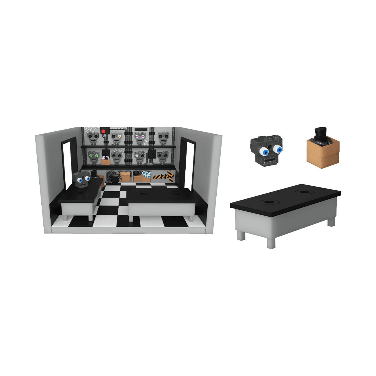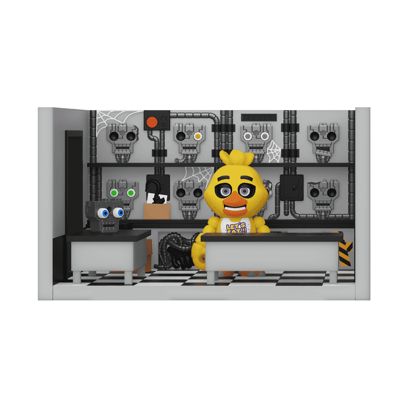 Close in on SNAPS! Chica in her Storage Room Playset before she moves! The Storage Room Playset with Chica comes with 11 customizable pieces, including 2 face pieces, 1 torso, 1 pair of legs, 1 accessory, 1 head, 2 tables, 1 robot head, 1 box with hat, and 1 playset base. You can attach the face pieces to any robot head on the wall for storage. The tables, robot head, and box with hat can be moved to customize each playset. Parts can be snapped to tables too! In fact, you can collect and connect playsets to create even more scary fun adventures.