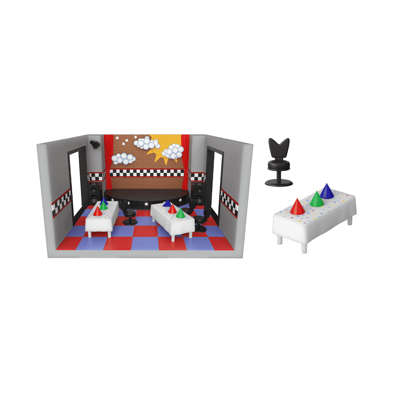 Close in on SNAPS! Golden Freddy in his Stage Playset before he moves! The Stage Playset with Golden Freddy comes with 12 customizable pieces, including 2 face pieces, 1 torso, 1 pair of legs, 1 accessory, 1 head, 2 tables, 3 chairs, and 1 playset base. Tables and chairs can be moved and customized. In fact, you can collect and connect playsets to create even more scary fun adventures.