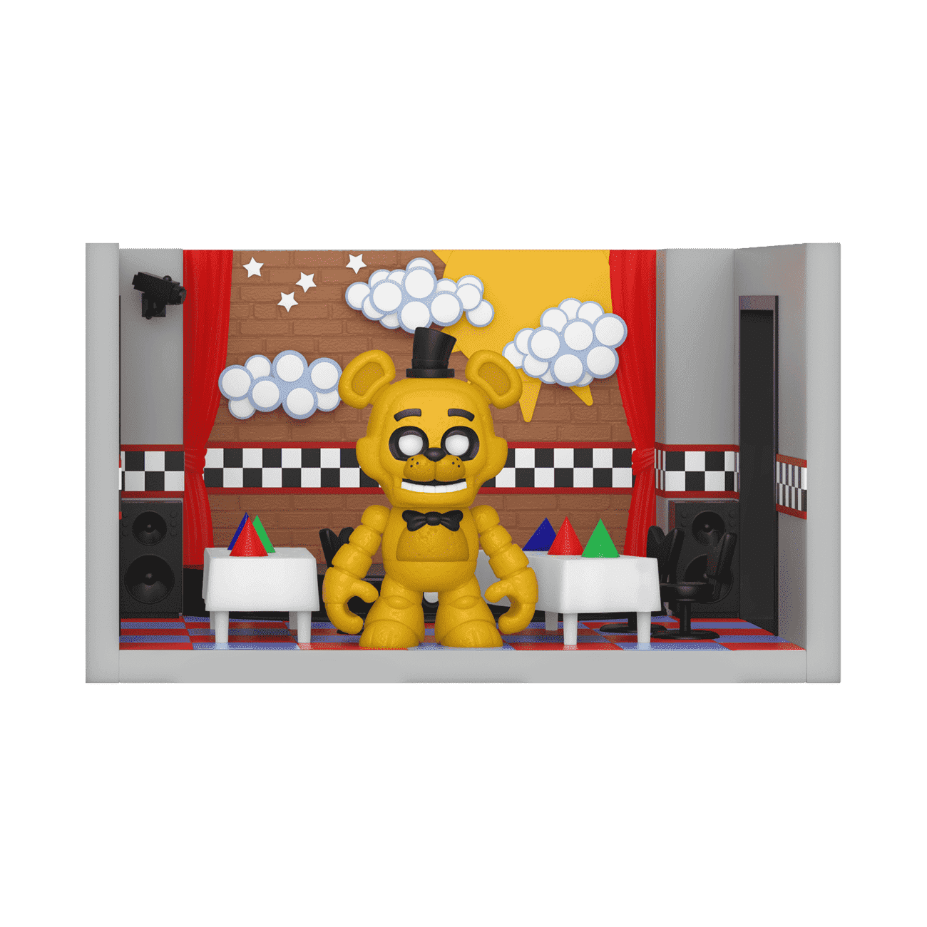 Vinyl SNAPS! Golden Freddy is approximately 3.50-inches tall. Approximate Dimensions of the Playset: 8.6” W x 5.1” H x 8” D.